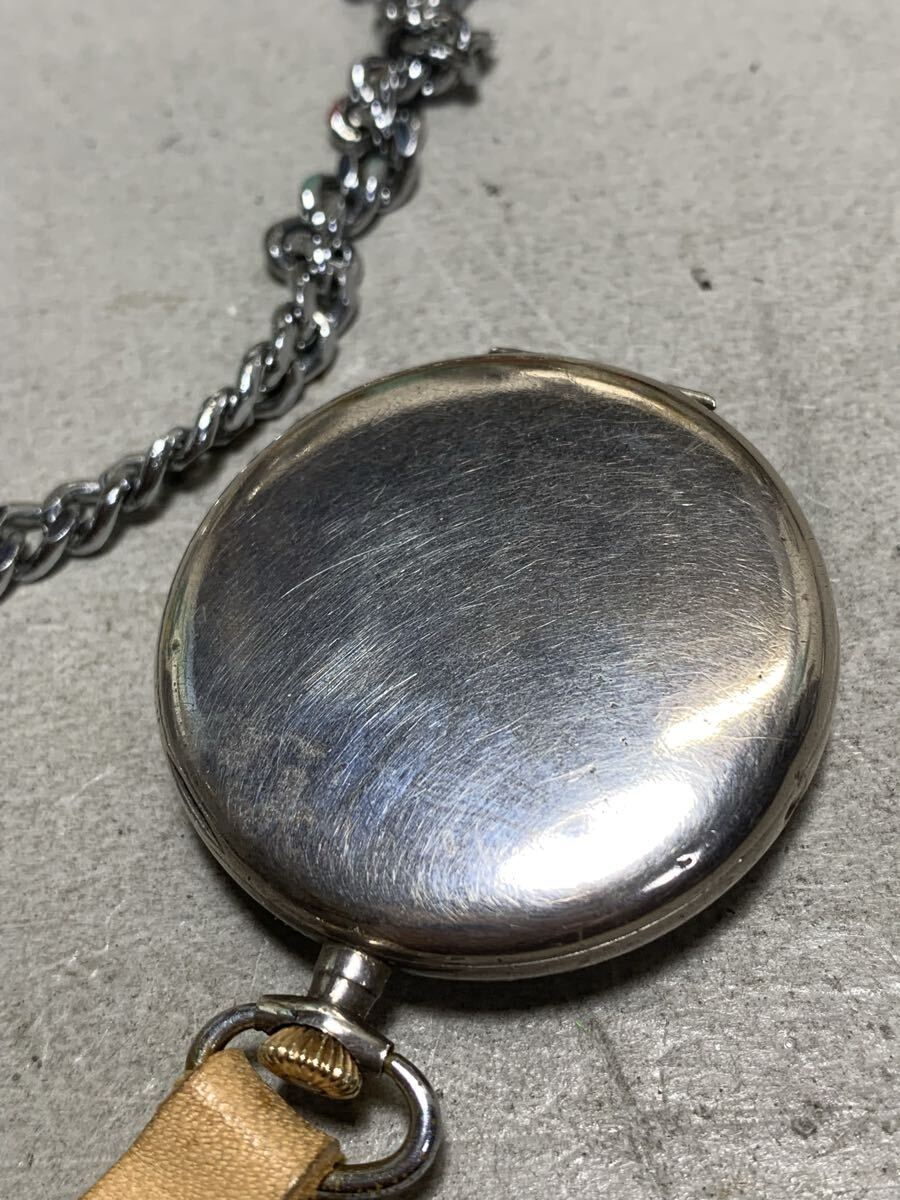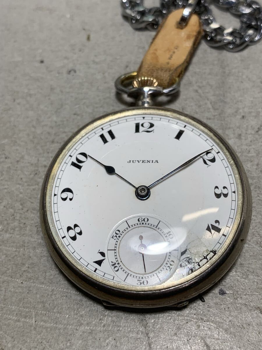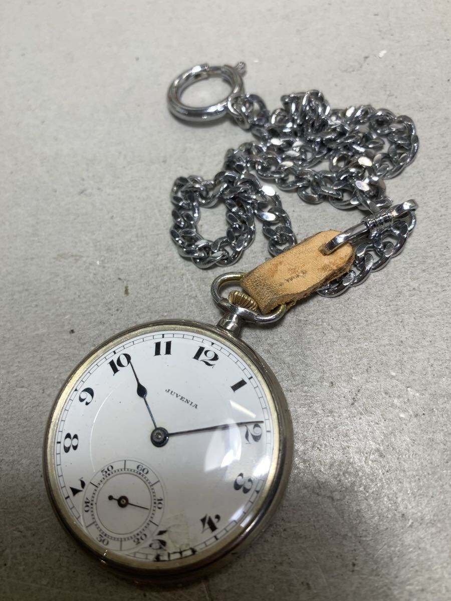 ムーブメントはJUVENIAの手巻きムーブメントですが、石数の記入がありません。たぶん15石だと思います。テンプは巻き上げヒゲです。動作は順調ですが、時刻合わせのリュウズ操作にクセがあります。リュウズを引き気味にしながら操作してください。古い機械式時計ですので、高齢者を慰るように扱ってください。付属のクロムメッキチェーンは約33センチ長さです。