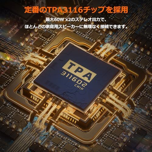 高効率TPA3116チップ & クリアな60W×2出力 : TI社製クラスDアンプチップTPA3116を搭載し、4-8Ωスピーカーに対し60W×2の高効率パワーを実現。エネルギー変換効率85%以上で発熱を抑制し、密閉空間でも安定動作。 音質設計の根拠:全高調波歪率0.04%(1kHz時)、周波数特性20Hz-20kHz(±1.3dB)の広帯域再生により、アコースティックギアの繊細な倍音からオーケストラのダイナミックレンジまで忠実に再現。付属DC19V電源アダプター使用時は最大出力を発揮し、書斎用コンパクトスピーカーから中型ブックシェルフまで幅広く駆動可能。
