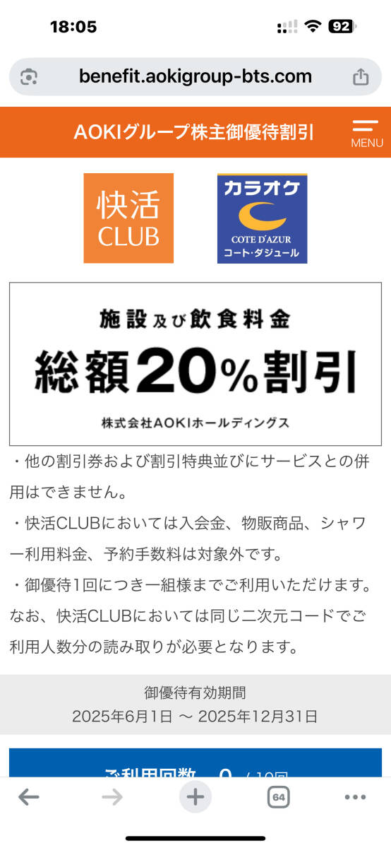 AOKI ホールディングス電子割引券 快活CLUBの20%引きクーポン QR画像1個