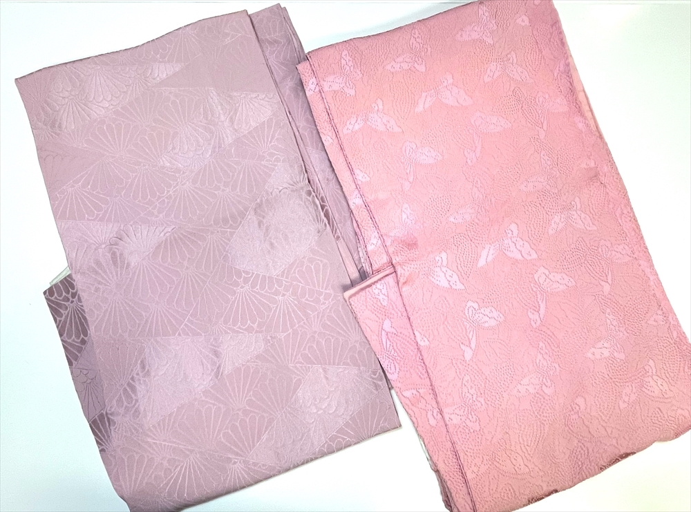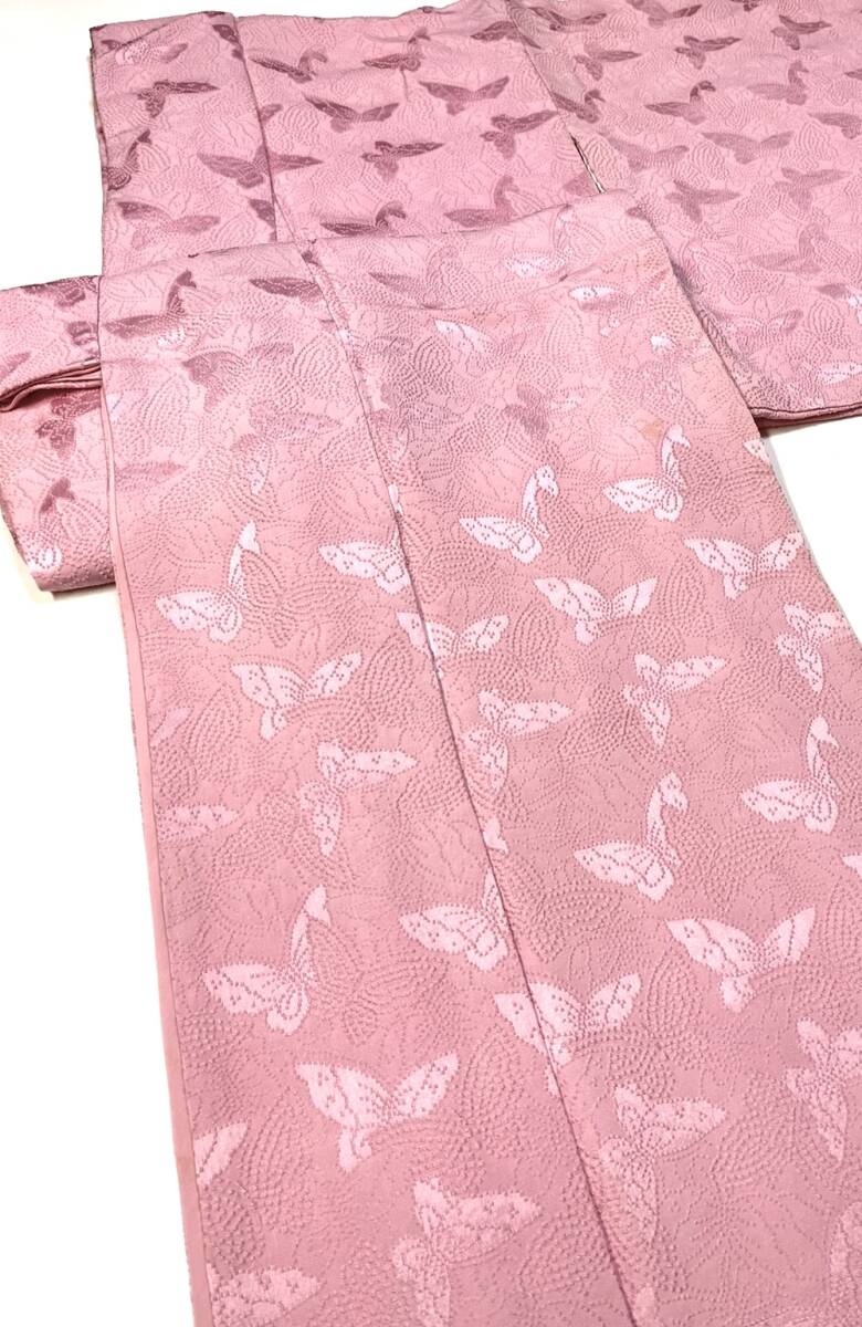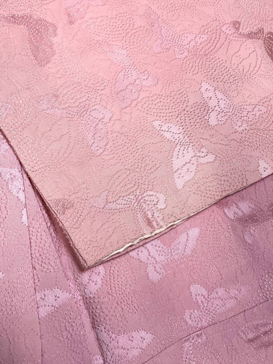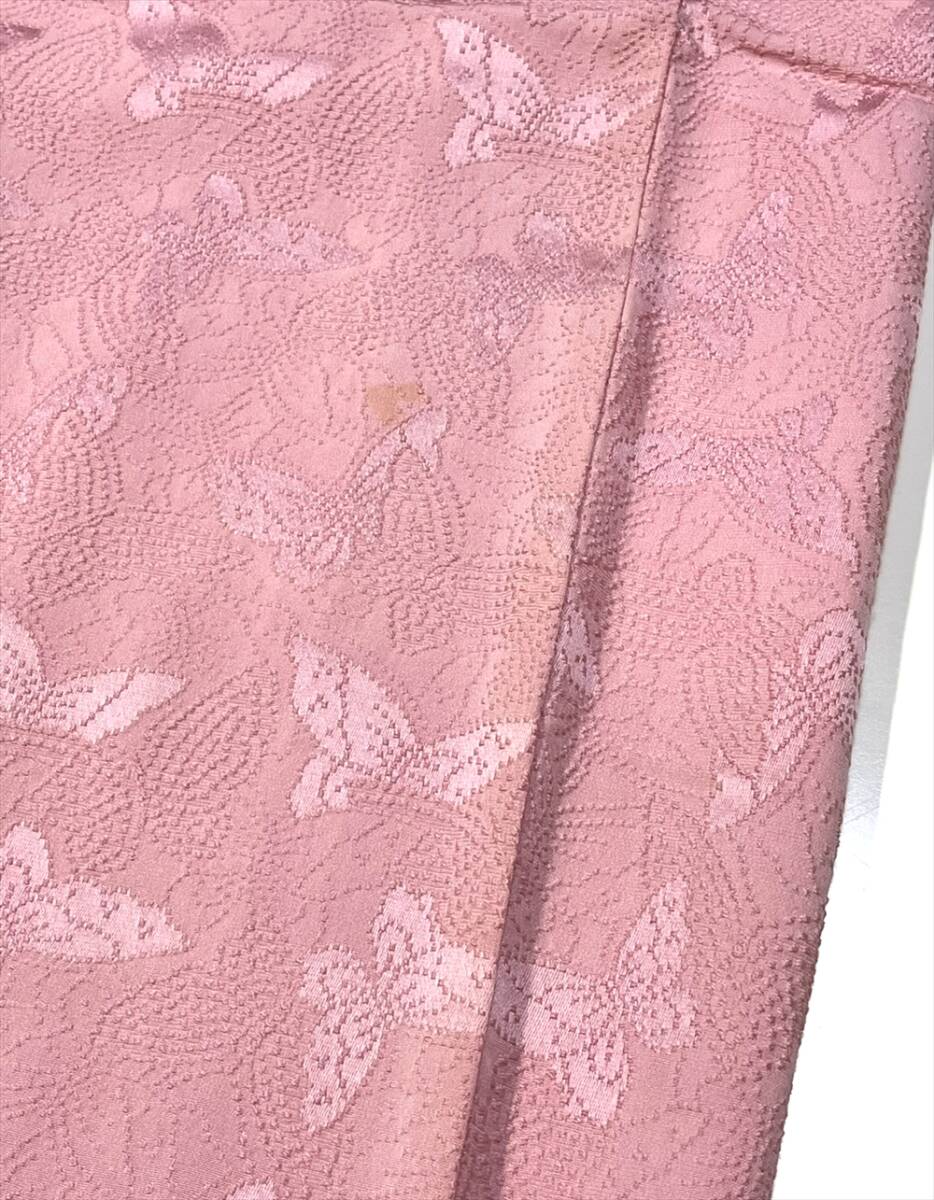 花とら●リサイクル着物 色無地 2枚まとめて ピンク 薄紫 ふくれ織 蝶 菊 単衣 着用可能 リメイク 素材 251126