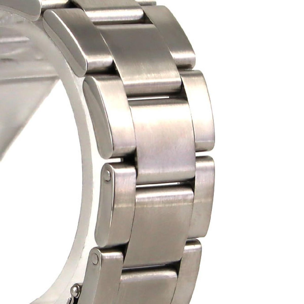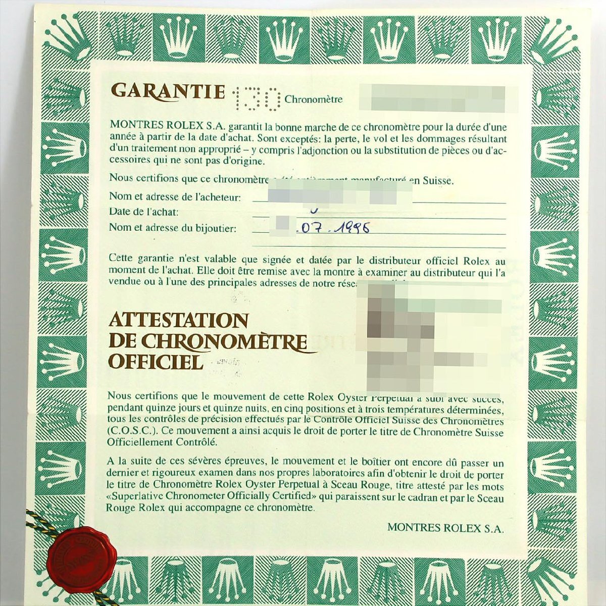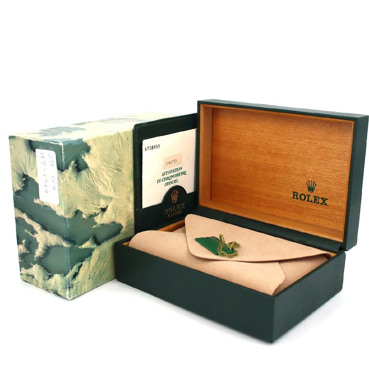 1990年頃に登場し、2001年頃まで生産されたエクスプローラーI、型式「14270」。風防がプラスチックからサファイアクリスタルへ変更され、アワーマーカーにホワイトゴールドの縁取りが採用されるなど、現代的な仕様となった世代です。象徴的な「3・6・9」インデックスはそのままに、高級感と視認性が向上しました。ムーブメントには、当時のサブマリーナーデイト無しにも搭載された信頼性の高い自動巻き「Cal.3000」を搭載。ケース径36mmの不変的なデザインで高い人気を誇る一本です。