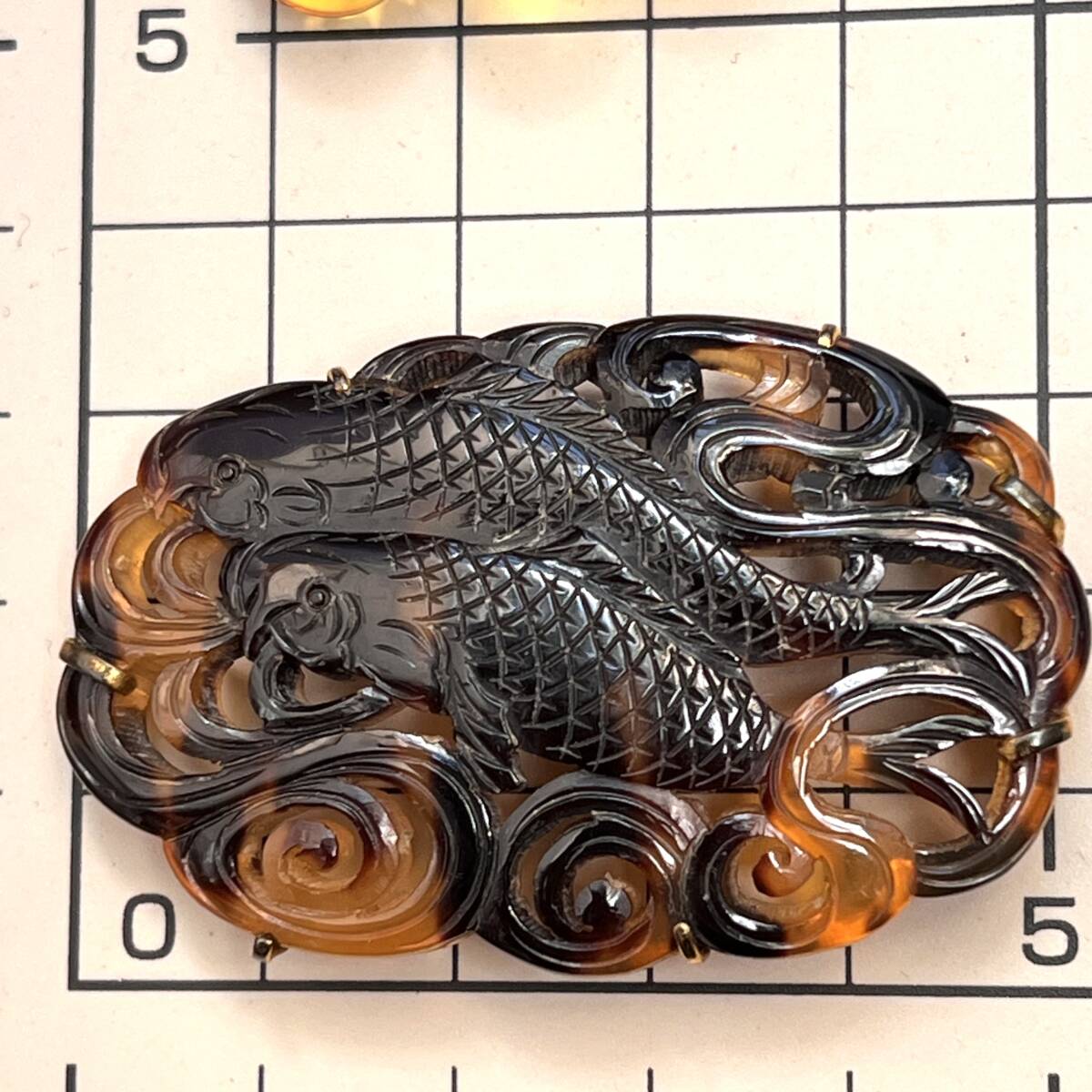 大きな鯛とやや小さい鯛が2匹、渦潮の中を泳ぐ様が彫られたべっ甲の帯留めです。