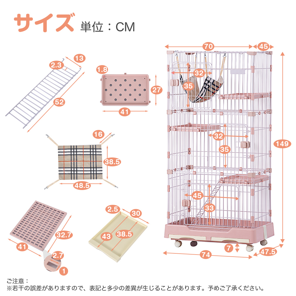 猫 ケージ キャットケージ ペットケージ キャスター付 猫ゲージ 大型 多頭飼い ネコドア キャットハウス 1段2段3段可能 (3段,ピンク)