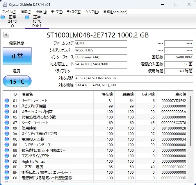 CrystalDiskInfoで正常と表示されています。