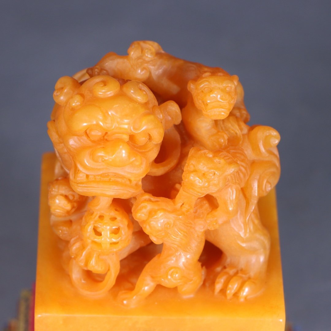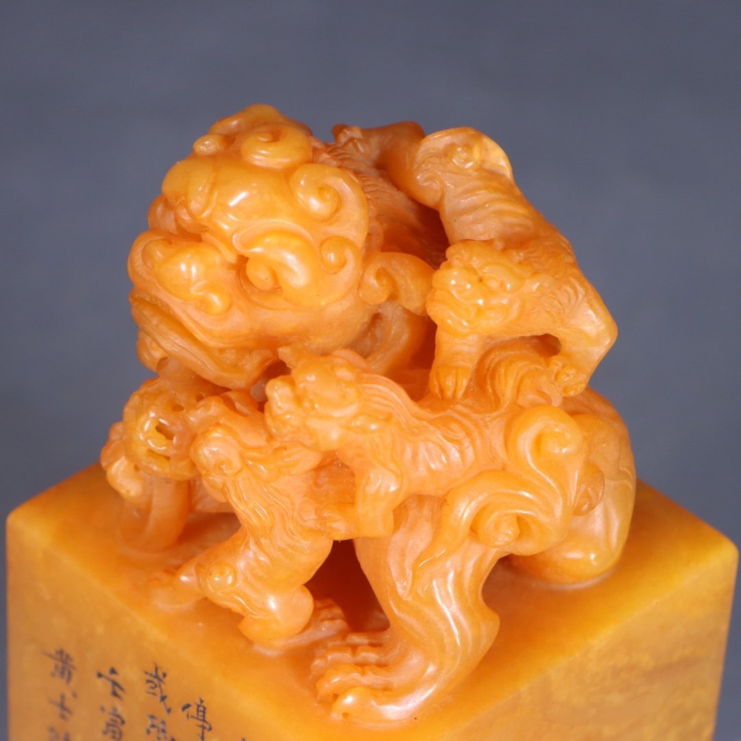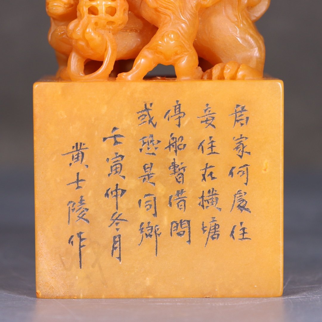 【安】清時代 黄士陵銘 寿山田黄石彫 獅子戯球鈕印章 印鑑 共箱 極細工 古置物 古擺件 中国古美術 時代物 301 サイズ(約寸) |