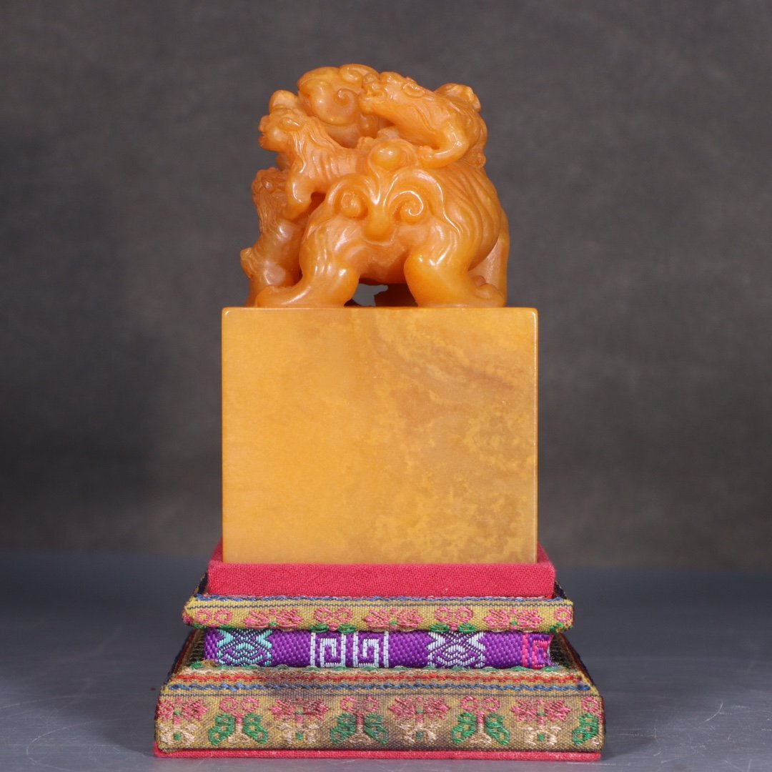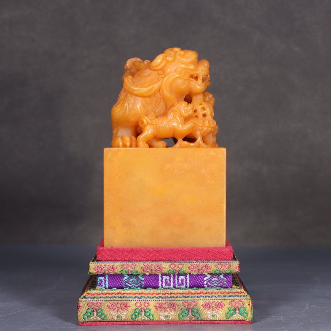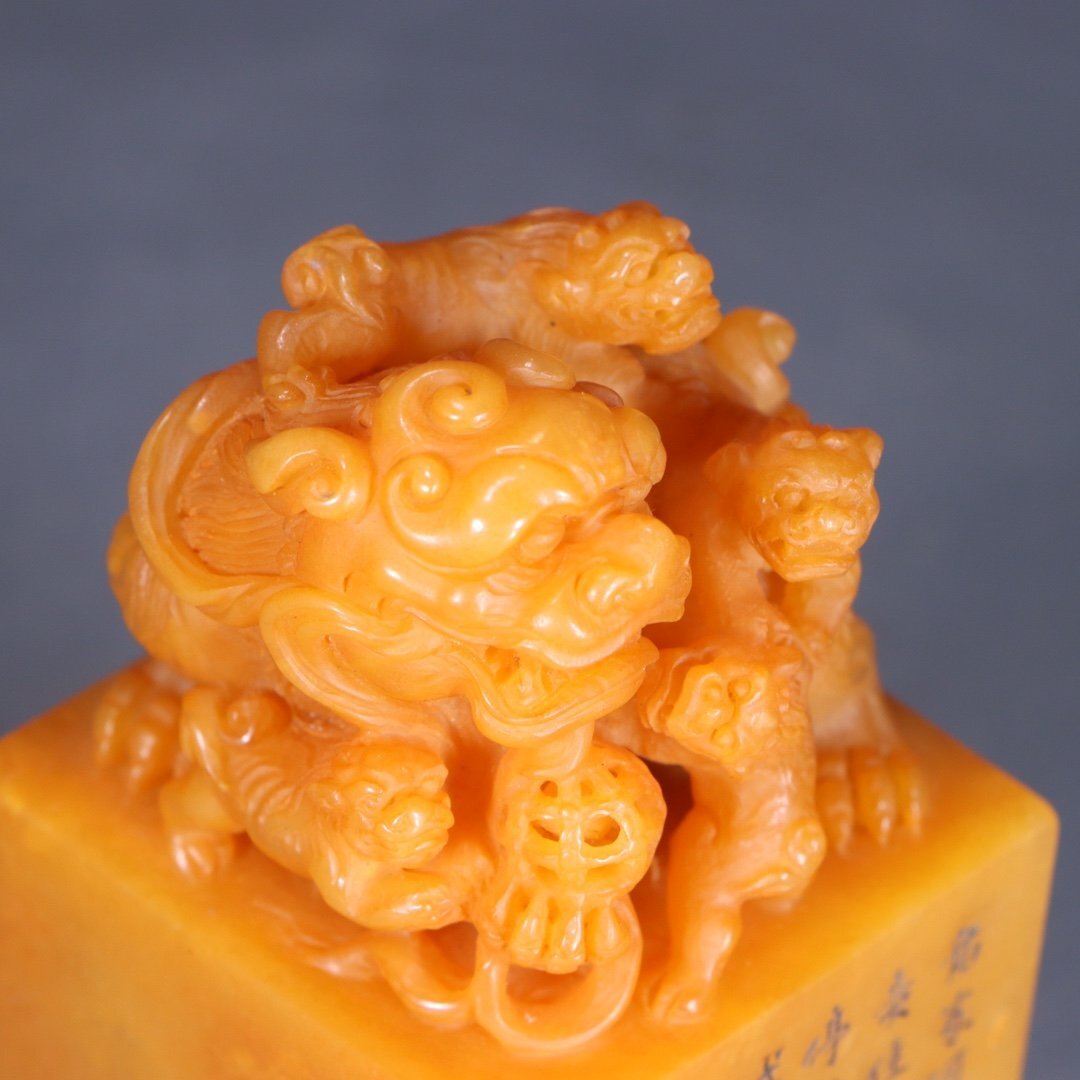 【安】清時代 黄士陵銘 寿山田黄石彫 獅子戯球鈕印章 印鑑 共箱 極細工 古置物 古擺件 中国古美術 時代物 301 サイズ(約寸) |