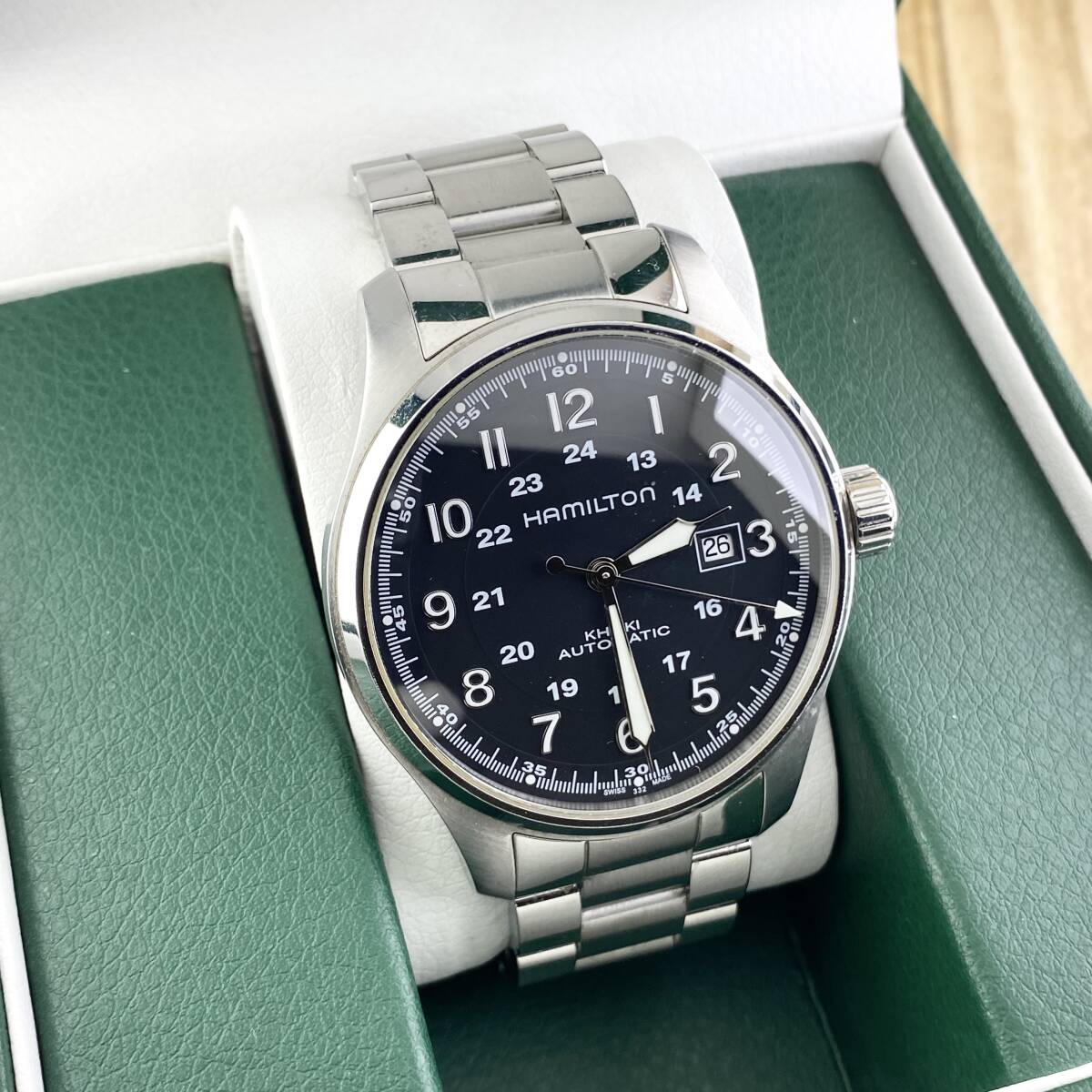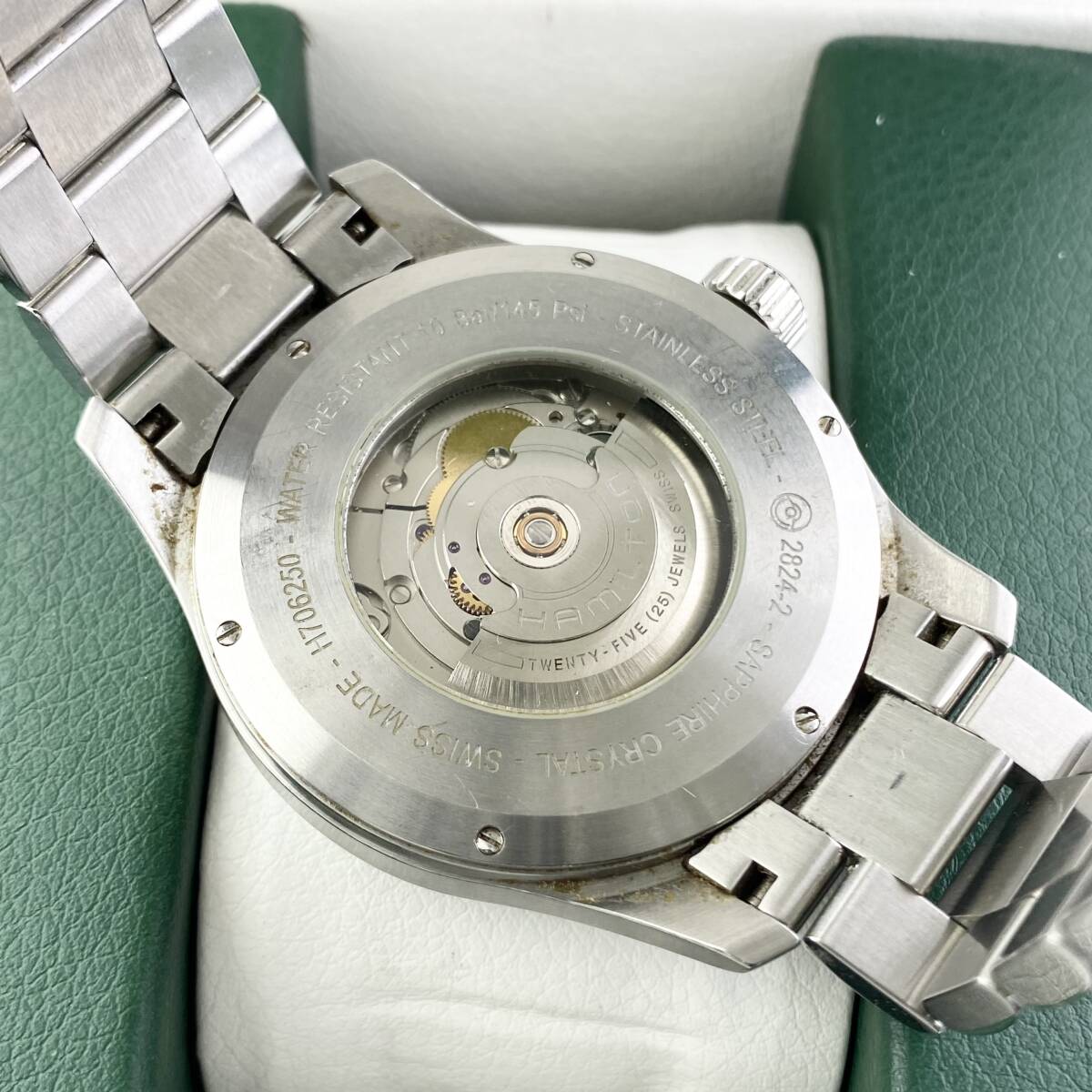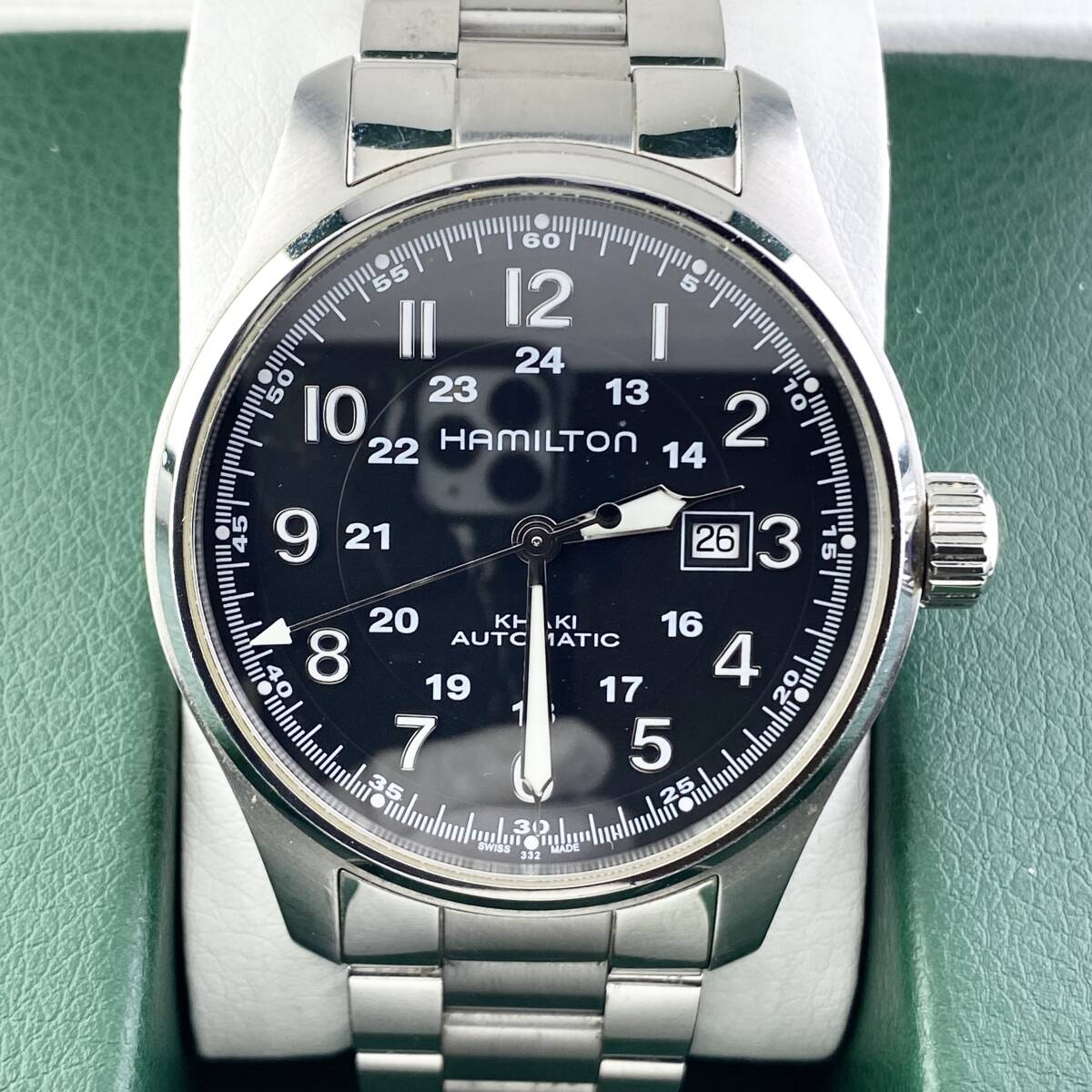【1円〜】HAMILTON ハミルトン 腕時計 メンズ AT 自動巻 KHAKI カーキ H706250 ブラック文字盤 ラウンドフェイス 裏スケ デイト 可動品 | |||