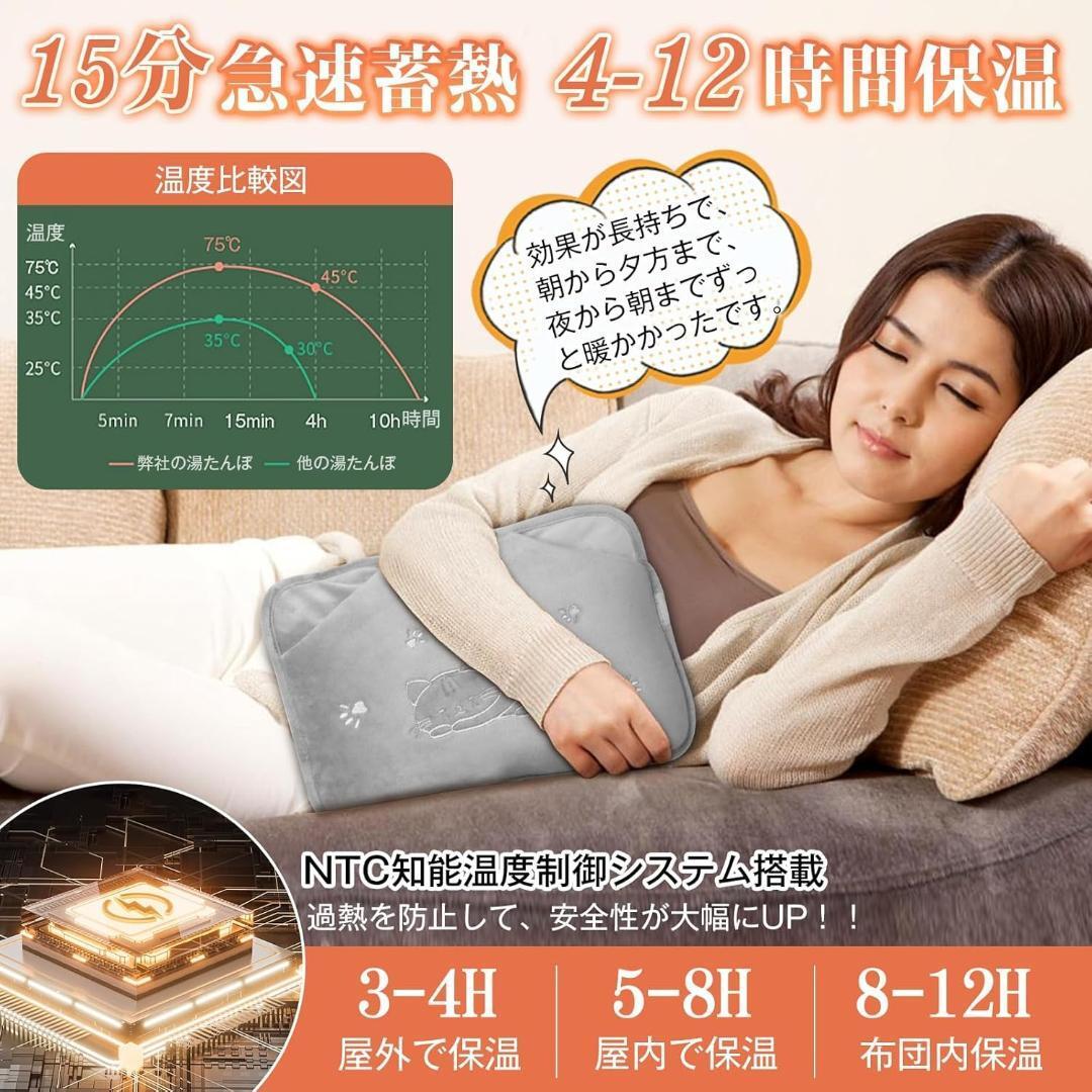たった15分の急速充電で、布団の中なら最長12時間もじんわりポカポカ。寝る前に布団の中央へ入れておけば、入った瞬間、ぬくもりに包まれて夢心地。