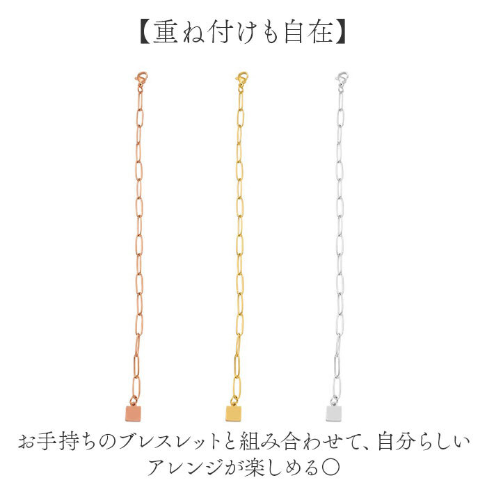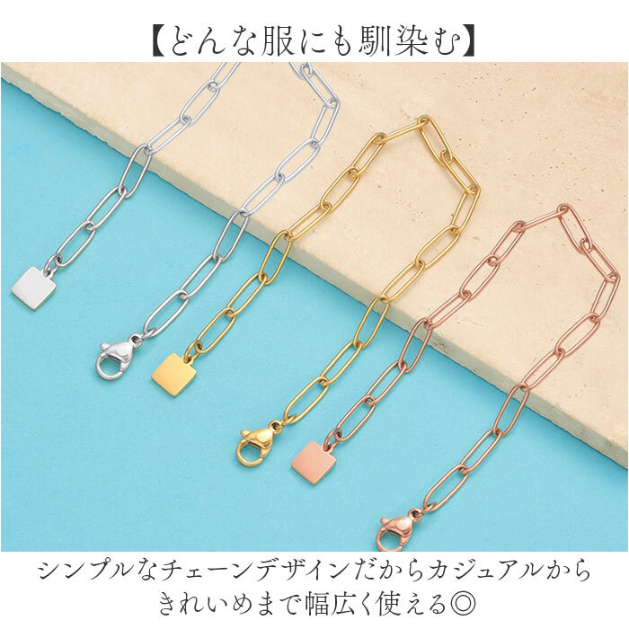 | 商品説明 | ・・【手首で魅せる華奢見え】 ・大人の抜け感で女性らしさを演出♪「チェーンブレスレット」。 ・【どんな服にも馴染む】 ・シンプルなチェーンデザインだからカジュアルからきれいめまで幅広く使える◎ ・【スクエアチャームがポイント】 ・先端のスクエアモチーフがさりげないアクセント♪ ・【カニカン式で付け外しらくらく】 ・留め具のつまみを使って簡単に装着できて落としにくい! ・【重ね付けも自在】 ・お手持ちのブレスレットと組み合わせて、自分らしいアレンジが楽しめる〇 |