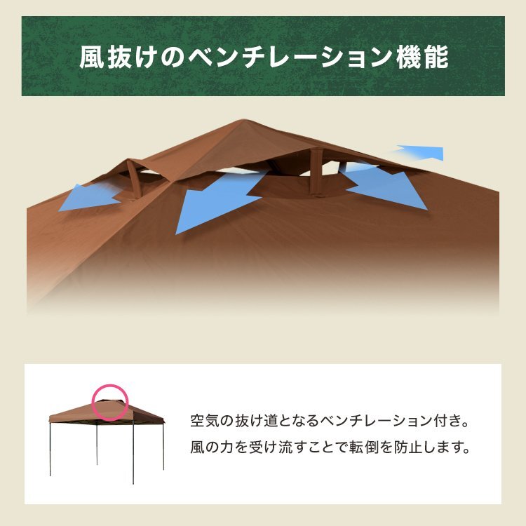 アウトドア、運動会、その他イベントなどに! 組み立てはワンタッチ! 他にもこだわり機能がたくさん♪ 【商品仕様】 カラー:コヨーテブラウン サイズ(約): ・使用時:幅300×奥行300×高さ260cm ・収納時:幅120×奥行20×高さ20cm 材質:スチール、ポリエステル 重量(約):11kg 【セット内容]】 タープテント本体 ロープ ×4 ペグ ×8 専用収納ケース ※注意事項 ・生地には撥水加工が施されていますが、雨天・豪雨下での完全防水を保証するものではございません。 ・風速5m以上の風の吹く場所でのご使用は、転倒や破損の原因になります。 ・設営の際は、2人以上で丁寧に作業を行いしっかりと固定してください。 |