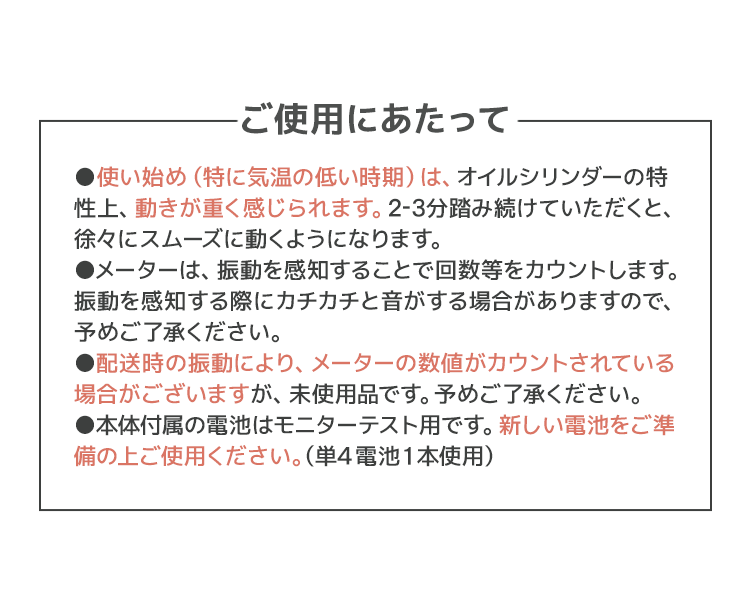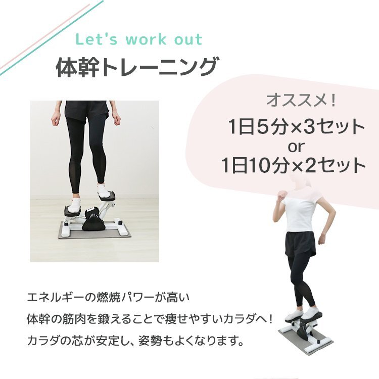 \初心者さんからシニアまで!ながら運動で有酸素運動を/ ステッパーが自宅にあれば、テレビや会話を楽しみながら気軽に体を動かすことができます。 有酸素運動・筋トレ・体幹トレーニングなど、これ1台で様々なトレーニングができます! 体幹の筋肉を鍛えることで痩せやすい体へ!体の芯が安定し、姿勢の改善にも効果的です! 高耐久シリンダーを採用。120分の連続使用が可能です。 4モード付モニター搭載!運動目安が分かりやく、毎日欠かさずトレーニングできます。 コンパクトな設計で、女性でも軽々持ち運べる♪省スペースに収納できます。 【商品仕様】 ・カラー:ブラック×ホワイト ・サイズ:(約)幅50×奥行32×高さ25.5cm ・商品内容:本体×1、保護マット×1、エクササイズバンド×1、取扱説明書×1、単4乾電池 ×1 ※乾電池は試運転のものとなり電池残量が少ない場合がございます※ ・耐荷重:(約)100kgまで ・連続使用:120分 ・素材:スチールパイプ、ABS樹脂 【注意事項】 ・トレーニングの際には無理のない範囲でご使用下さい。 ・体調の悪い状態での使用はおすすめしません。 ・必ずマットなどを敷いてご使用下さい。 ・商品は、モニターによって色合いが異なって見える場合があります。 ・仕様・デザインは改良のため予告なく変更することがあります。 |