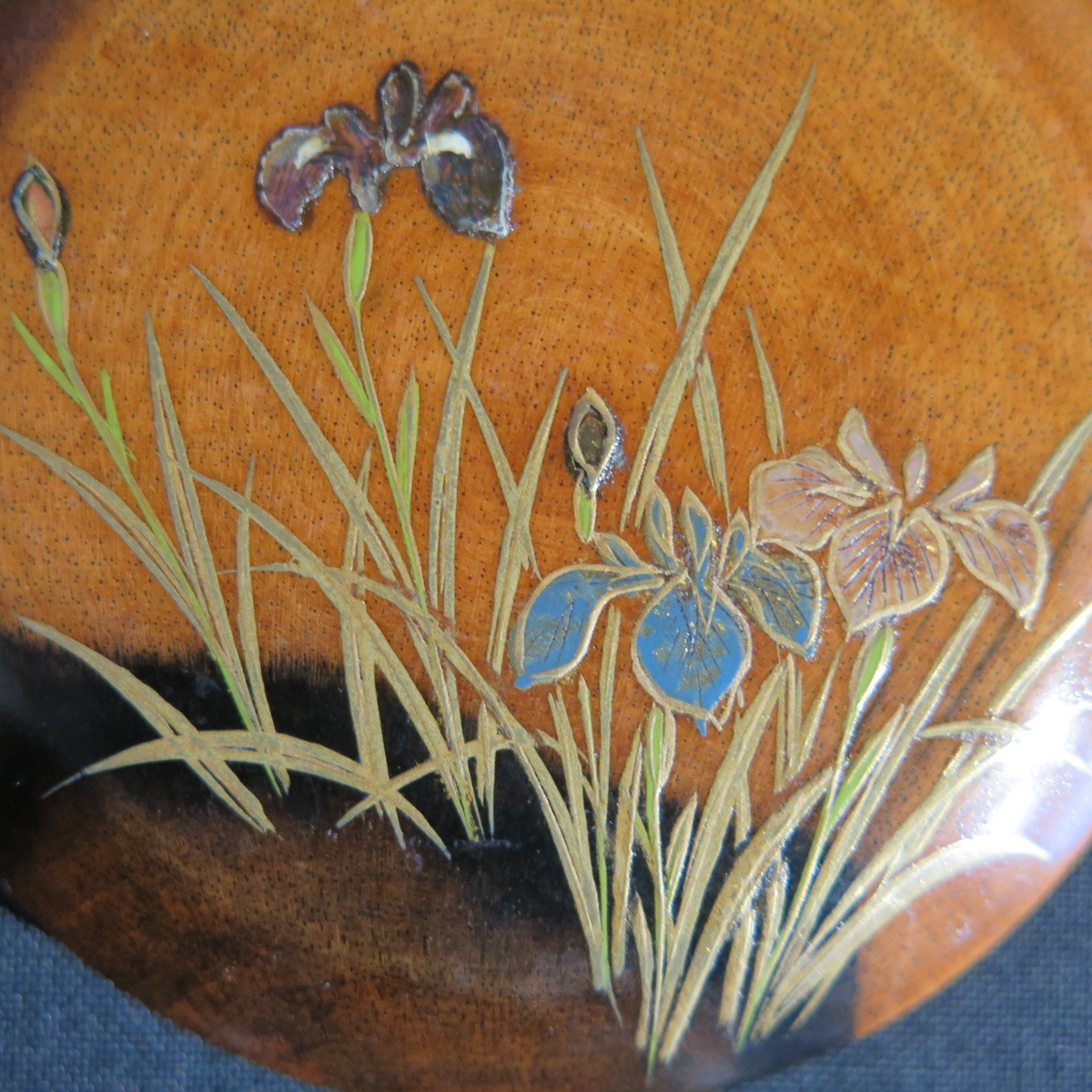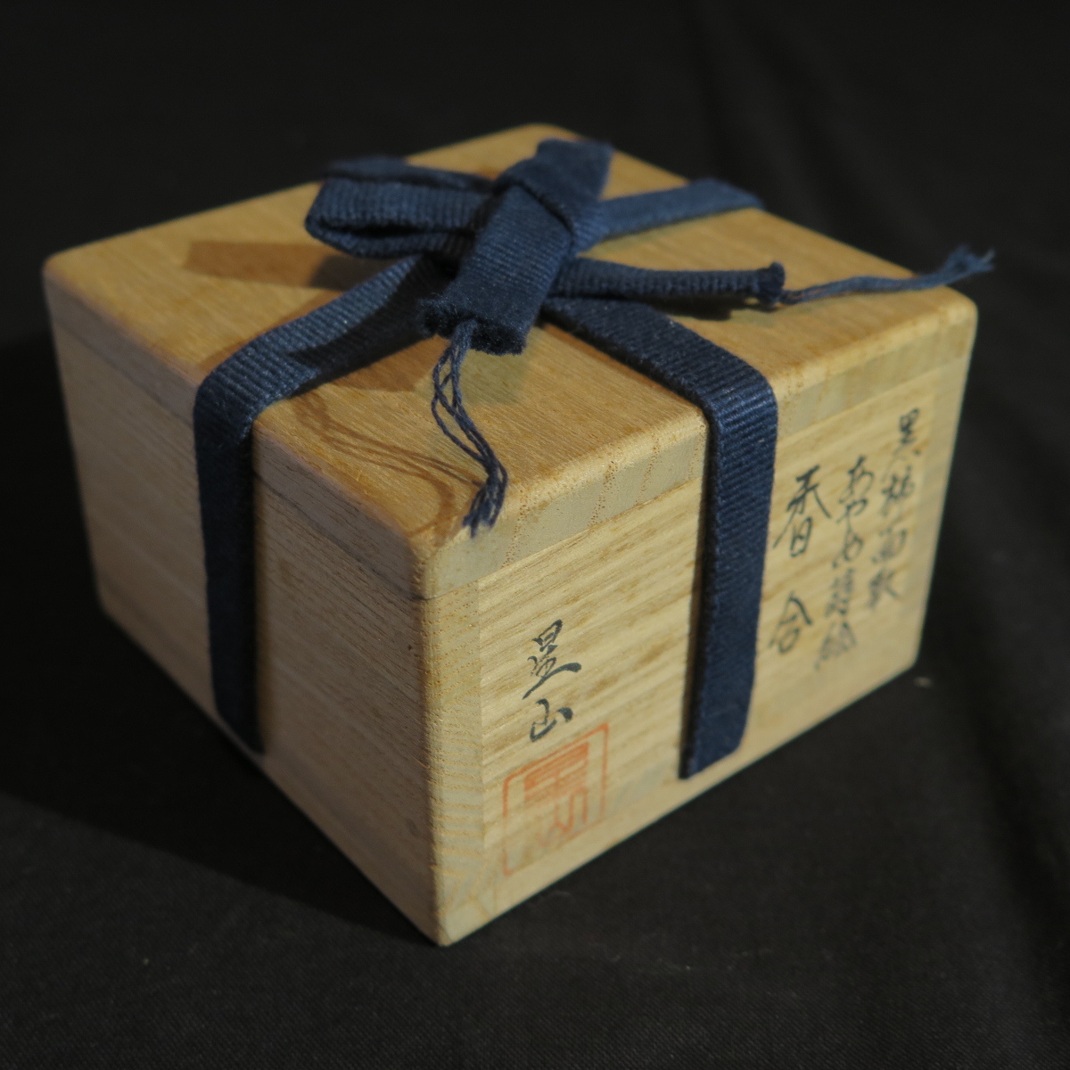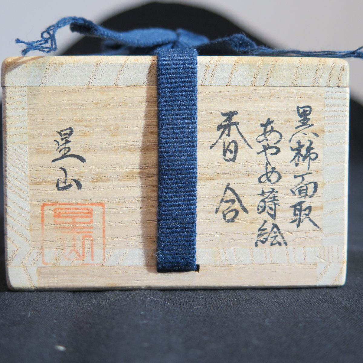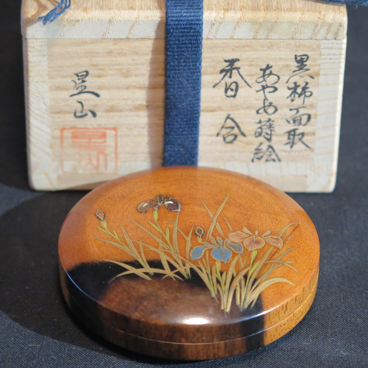 作品は 【 黒柿 面取 あやめ 蒔絵 香合 】黒柿部分を地に見立て、花の部分には貝螺鈿も使用されています。【黒柿】は柿の木1万本に1本の確率でしか現れないといわれる、非常に貴重な木材です。直径6.7㎝、高さ2.1㎝。使用感感じぬ良好な状態です。共箱付き、真作保証いたします。箱わずかにシミ汚れあります。