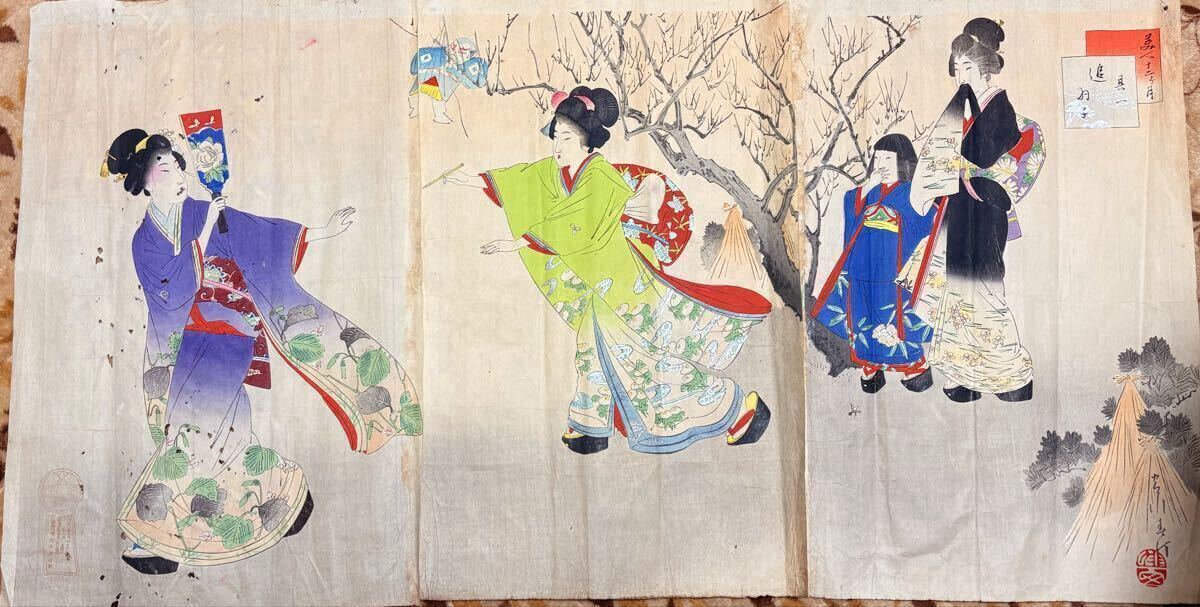 美人十二ヶ月は、春汀らしい柔らかな筆致で描かれた3枚続のシリーズで、季節を楽しむ人々の様子が丁寧に描かれている。