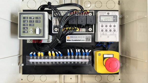 発電機制御ユニットとエンジン継電器制御モジュールを組み合わせ、信号線による制御で発電機の自動始動・自動停止を行います。