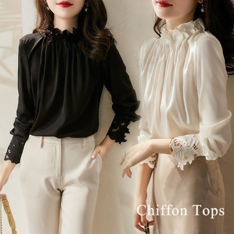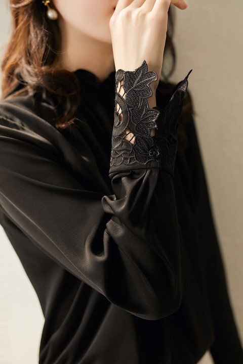 ・レース袖がエレガントなシフォントップス。首元のタックが華やかさと品のある印象に仕上げてくれます。
