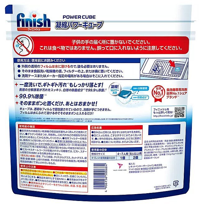| 商品の説明 | 【商品紹介】 フィニッシュのパワーキューブはポンと置くだけの凝縮キューブ。フィルム付きのタブレットだから手に洗剤がつくこともなく、食洗機にそのまま入れるだけ。 ≪小さいキューブに強い洗浄力が凝縮、タブレット独自のテクノロジー。≫ 2つの働きを層に分けているので、成分同士が交じり合うことなく、その力を発揮できるように設計されています。 国内で販売されている主要食洗機メーカーからも推奨されています。フィニッシュは食洗機メーカーとの技術交流を重ね、洗浄プログラムに適した洗剤の開発に積極的に取り組んでいます。 【確認事項】 使用前の確認 お手持ちの食器洗い乾燥機の取扱説明書をよく読んでご使用ください。 ●グラタンの焼きつき、茶碗蒸し、口紅汚れなどの頑固な汚れはあらかじめ落としてから洗浄してください。 ●残菜フィルターの残菜は、使用のつど取り除いてください。 ●標準(洗浄時間10分以上)もしくは念入り対応コースでご使用ください。短縮洗いコース(例:給水接続で10分以下)をご使用の場合、洗剤がとけきらない可能性があります。 ●ミストやスチームコースが搭載されている機種では、ミスト・スチーム段階での洗浄による効果は得られません。 [使えない食器]漆器、アルミ食器、クリスタルグラス、カットグラス、銀食器、金線・銅線・上絵付の食器、その他お手持ちの食器洗い乾燥機の取扱説明書にて禁止されているもの。 使用上の注意 ●子供の手の届く所に置かない。 ●これは食べ物ではありません。口に入れたり、飲み込んだりしない。 ●目に入ったり、皮膚についたりしないようにする。製品を濡れた手で扱わない。 ●使用後は手を水でよく洗い流す。 ●荒れ性の方は炊事用手袋を使う。 ●用途以外に使用しない。 ●使用後は必ずジッパーをきちんと閉め、高温、多湿、直射日光を避けて保管する。 原材料・成分 界面活性剤(12%ポリオキシアルキレンアルキルエーテル)、アルカリ剤(炭酸塩)、漂白剤(過炭酸ナトリウム)、結合剤、水軟化剤、漂白活性化剤、酵素 |