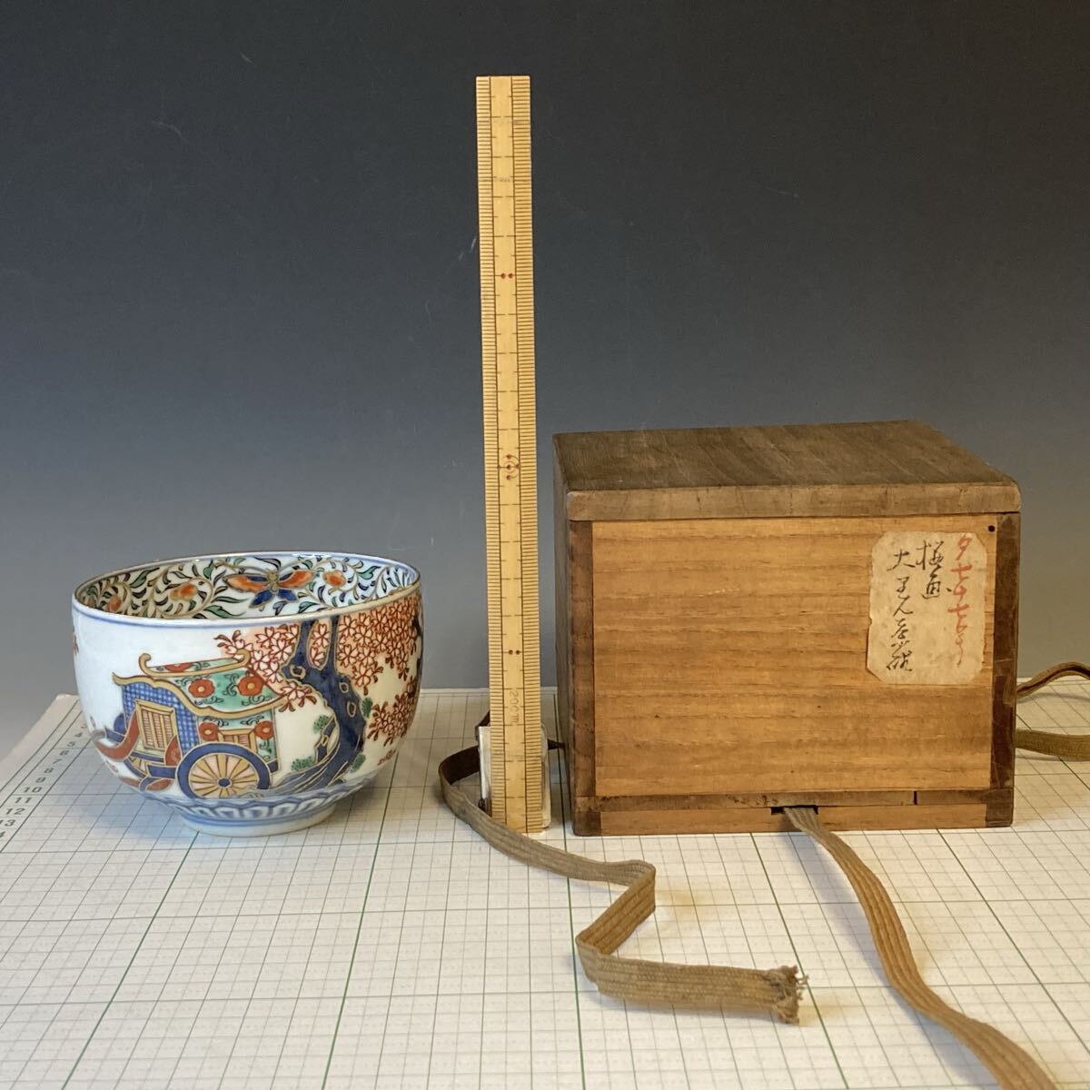 茶碗「雅な桜と牛車の図」古い茶道具(共箱あり)銘あり 内側に蝶と扇 大きさ(約)口径9cm、高さ6.5cm