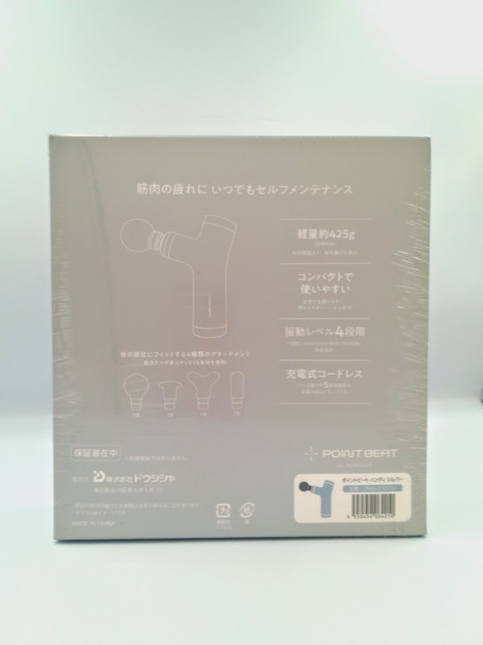 ドウシシャ 筋膜リリースガン ポイントビート ハンディ 軽量 4段階振動 充電式 4種類のアタッチメント付き シルバー DMG2101SVです。