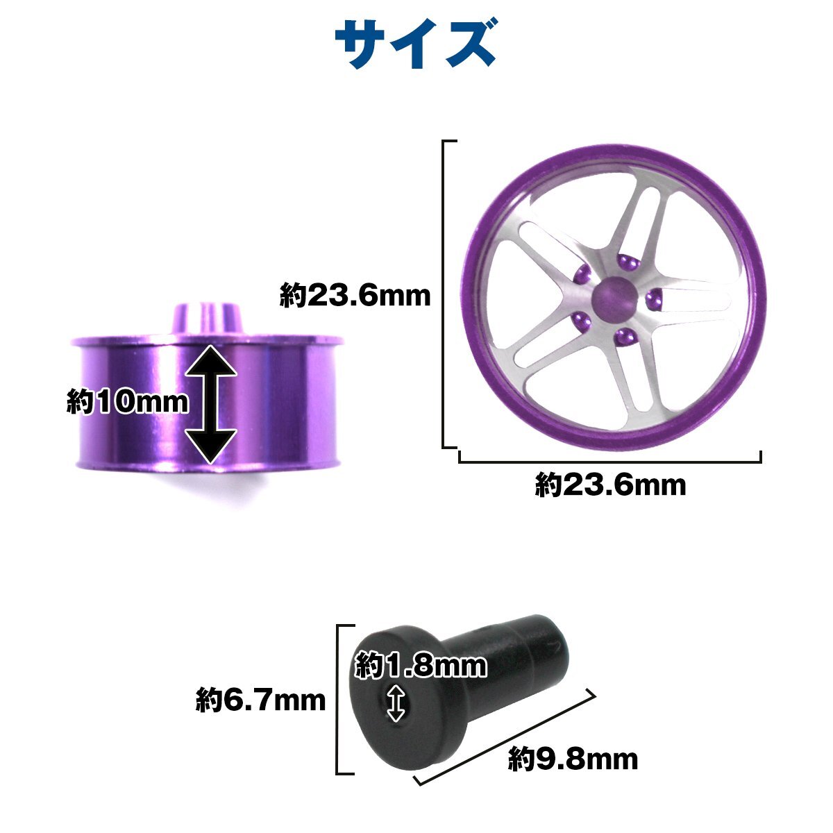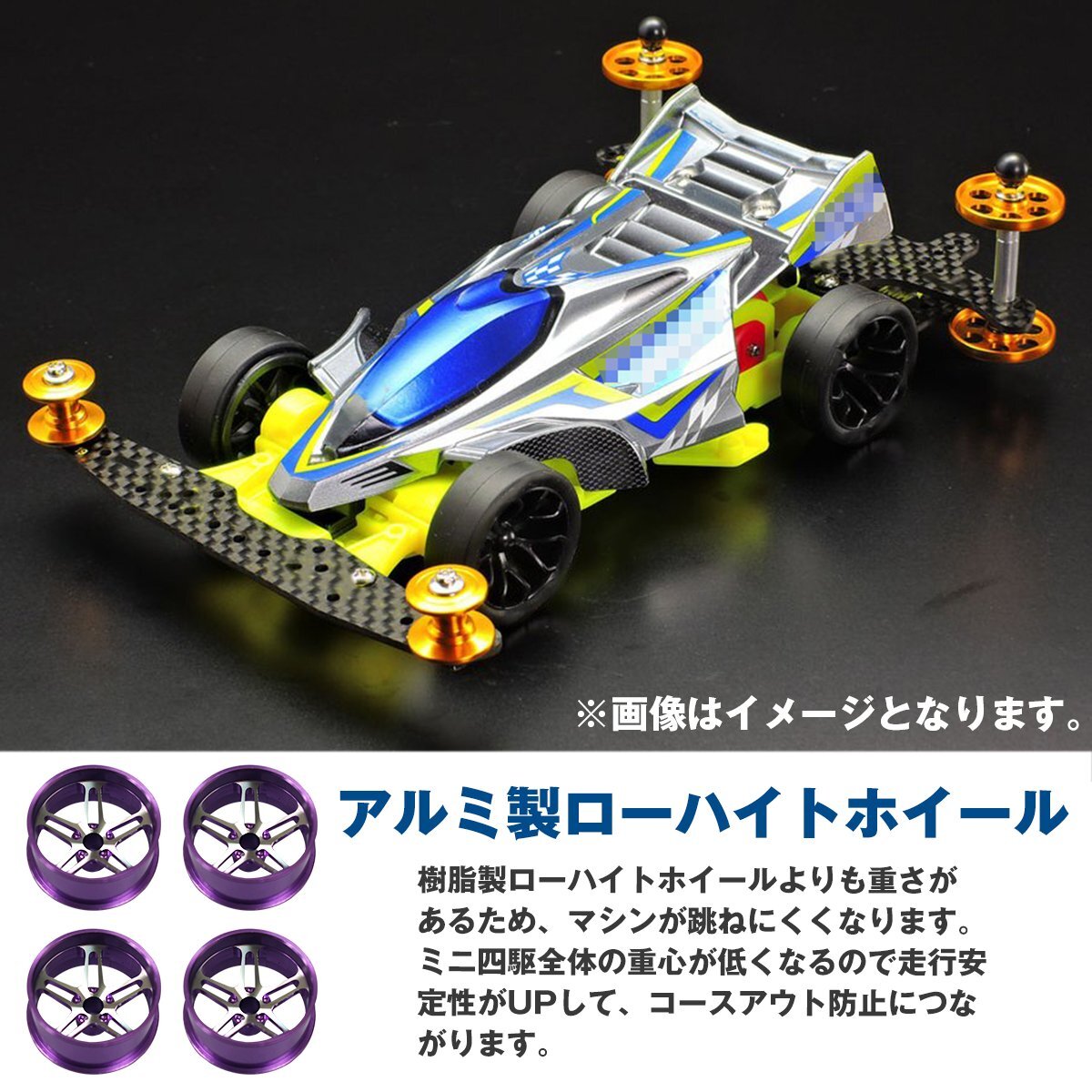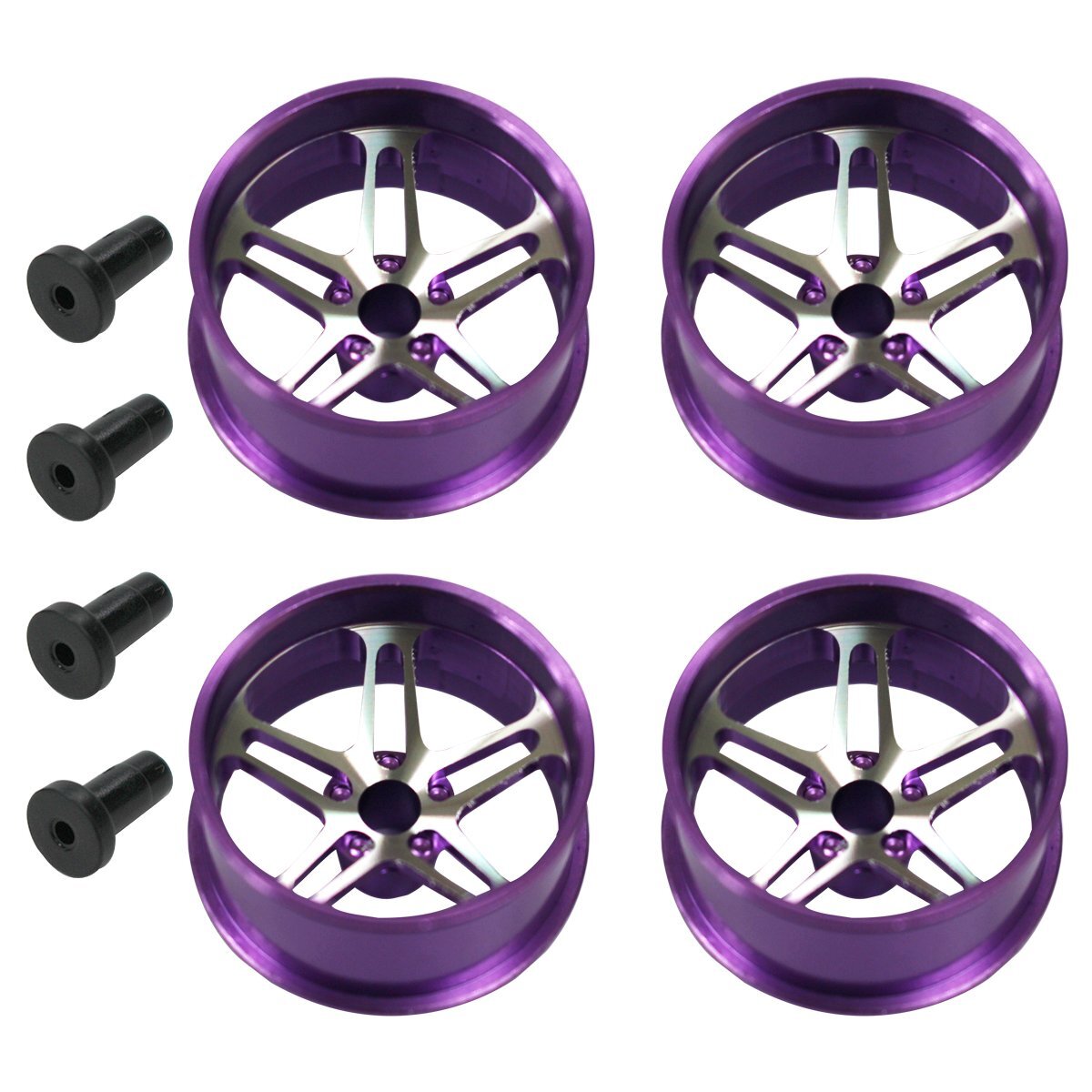 【送料無料】ミニ四駆用 4個セット アルミホイール ブラック デュアル 5スポーク 5穴 ローハイトタイヤ ホイル ホイール 紫 パープル