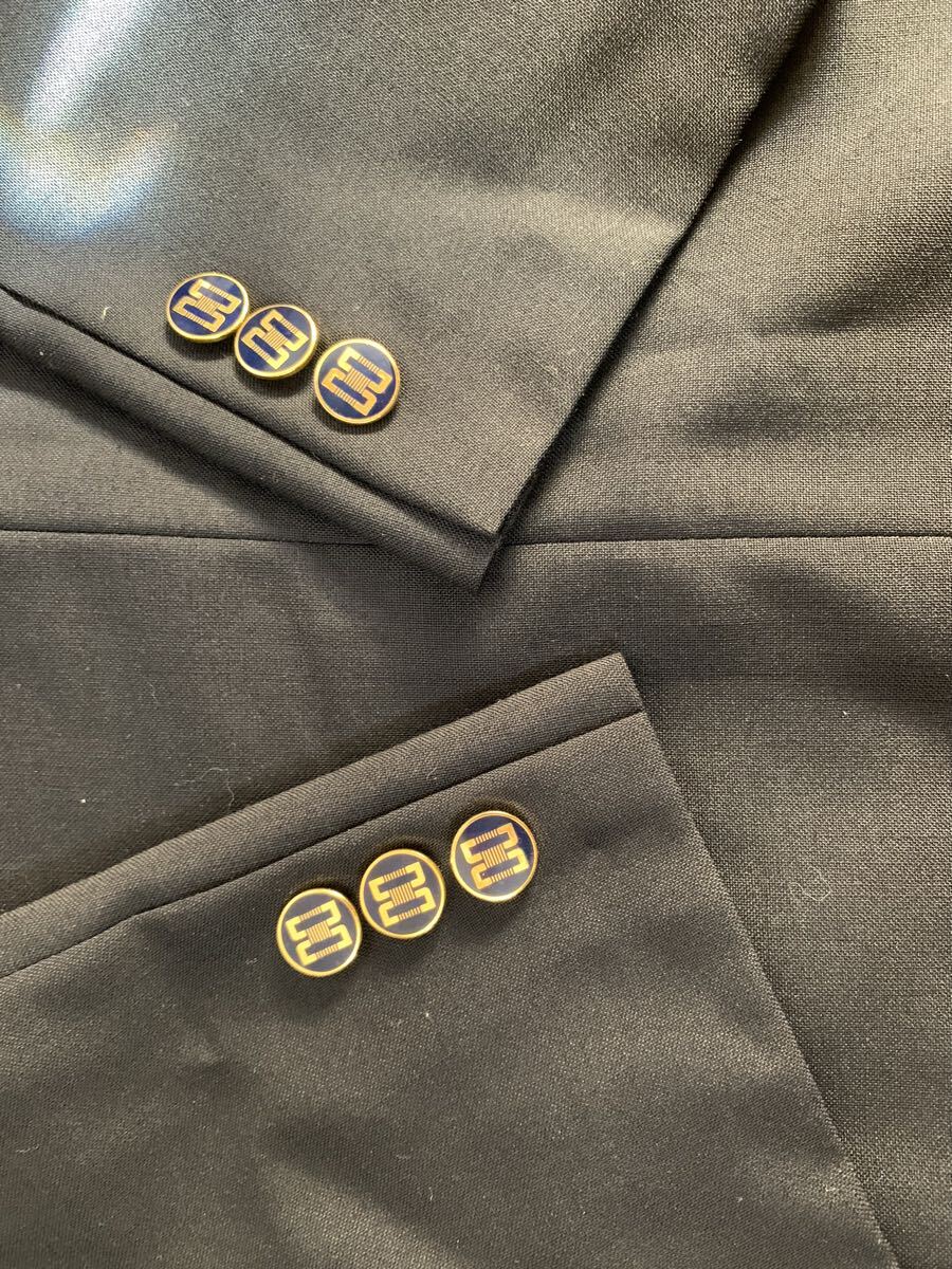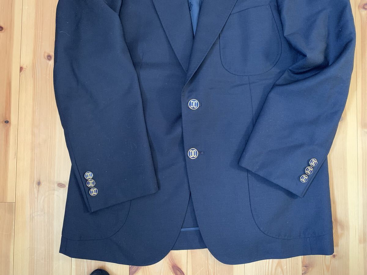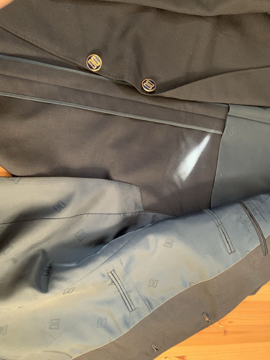ネイビーのDAKSテーラードジャケット、3つボタン、サテン内側仕上げ。