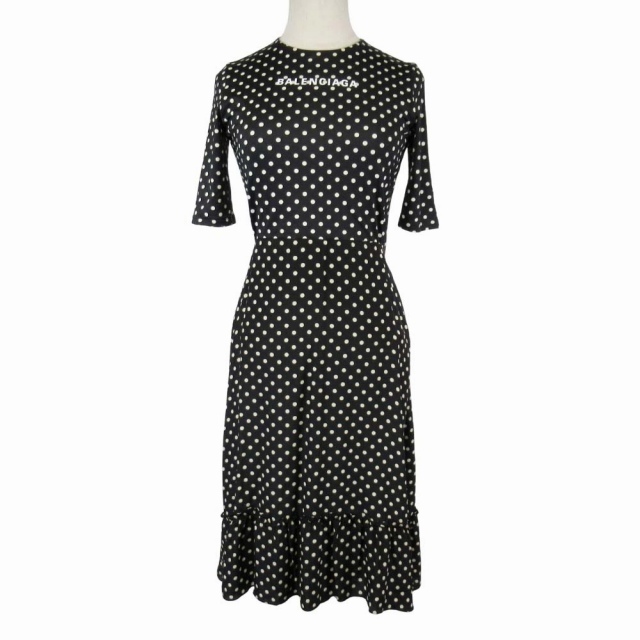 19aw バレンシアガ BALENCIAGA ドット フィッシュテール ワンピース ロゴプリント ストレッチ素材 ドレス 38 ブラック 571127/レディース