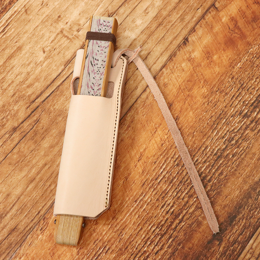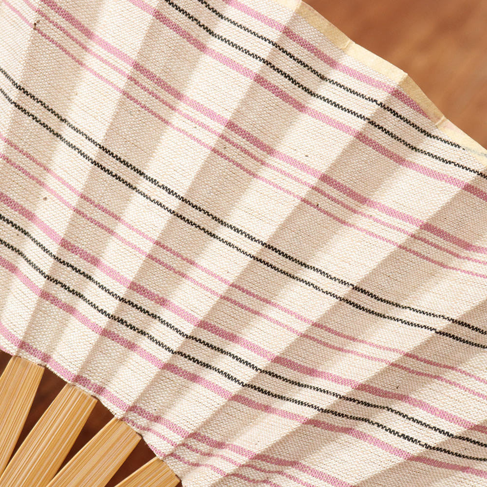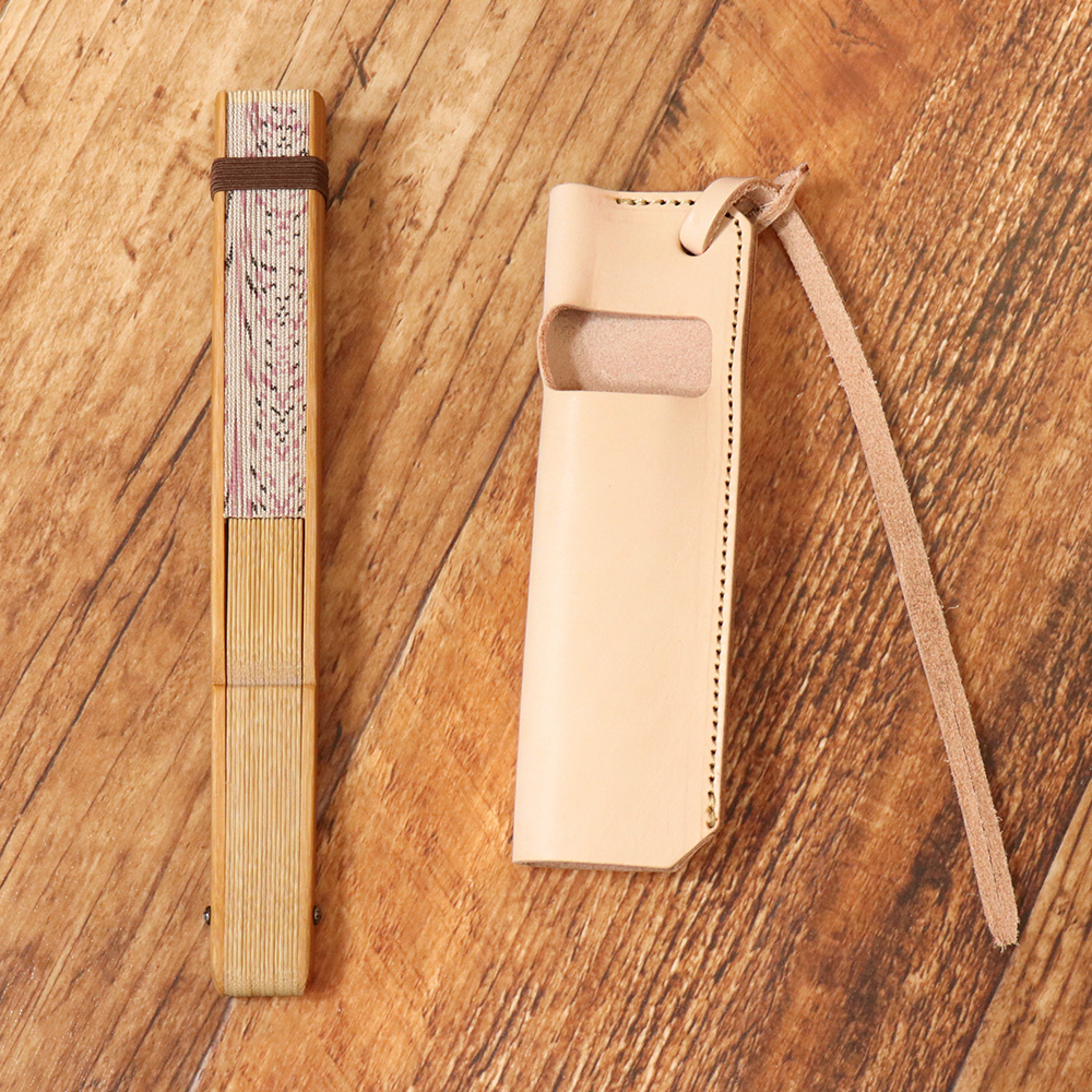会津地方で親しまれてきた会津木綿の扇子。素朴ながらも美しい地縞が特徴です。ヌメ革ケースはストラップでバッグに付けることができます。