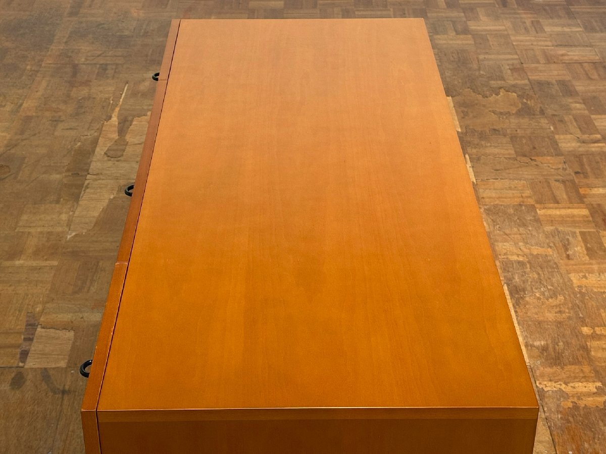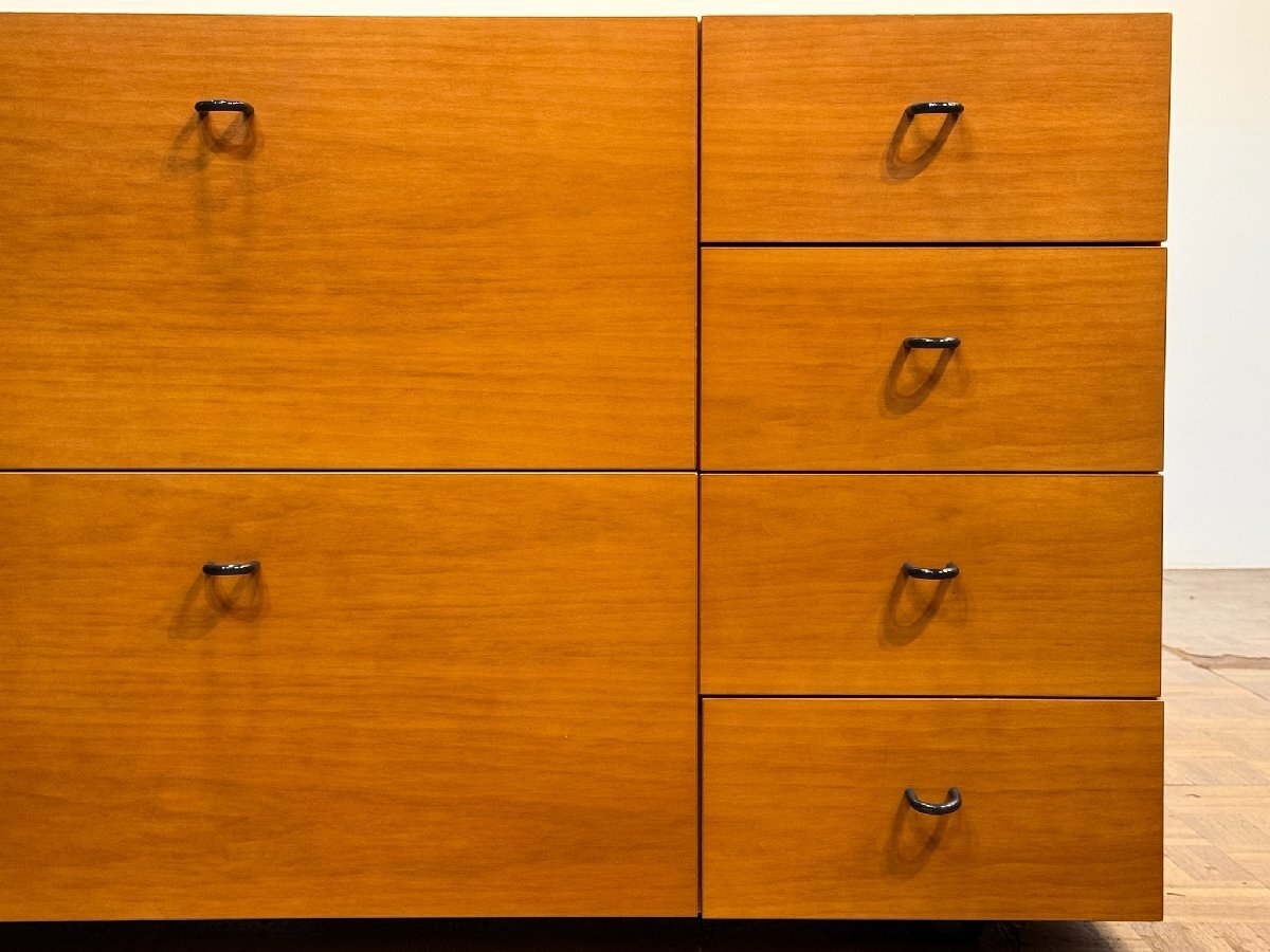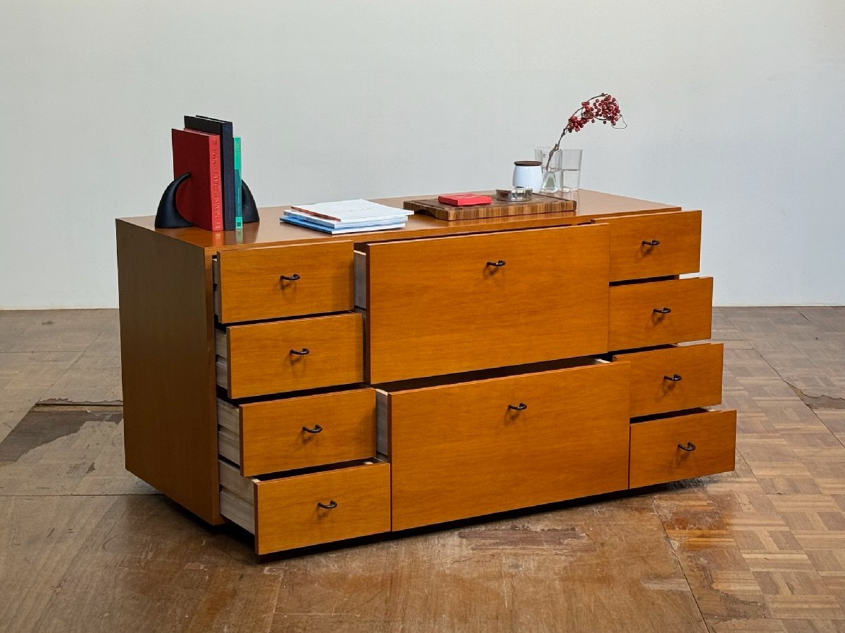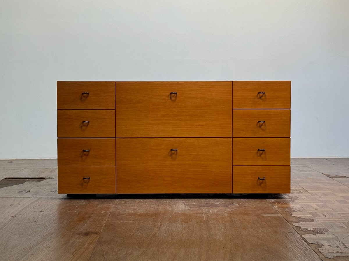 1979年のデザイン全盛期に、イタリアの女流デザイナーとして建築家としての確たるキャリアと、工業デザイン/プロダクトデザインを融合させた巨匠・Cini Boeri / チニ・ボエリが、arflex / アルフレックスブランドが根強くプロモーションしてきたイタリアンウォールナット材の静かながらにゆったりと湛えた美しい杢目の上品さと、インテリアを明るく軽やかに演出する飴色のカラーリングを全面に擁しつつ、ミニマルなハンドルで品性豊かに飾り上げた、当時らしいラグジュアリーな構成のサイドボードチェスト。arflex より。