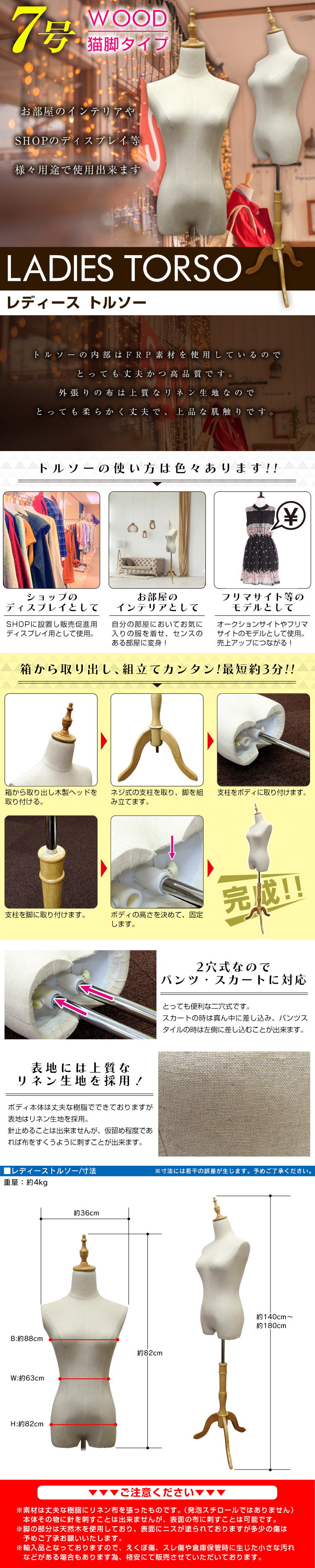首と足元が木製で温かみのあるトルソーです。 生地は高級感溢れるリネン製。 お好みの高さで使える調節機能付き。 本体下に差込みは2箇所ありますので、スカート、パンツ両対応です。 オークションやフリーマーケット、インテリアやハンドメイドなど、様々な場面でお使いいただけます。 【商品仕様】 サイズ(約):幅34cm × 高さ140〜180cm ボディ寸法(約):バスト85.6cm、ウエスト65.3cm、ヒップ84.4cm、肩幅34cm、背丈80cm 素材:FRP素材、リネン、スチール ※輸入品となりますので、えくぼ傷、擦れ傷や倉庫保管時に生じた小さな汚れ がある場合がございます。 ※脚の部分は天然木を使用しており、表面にニスが塗られておりますが多少の傷が ございます。 【もちろん新品未使用品です】 |