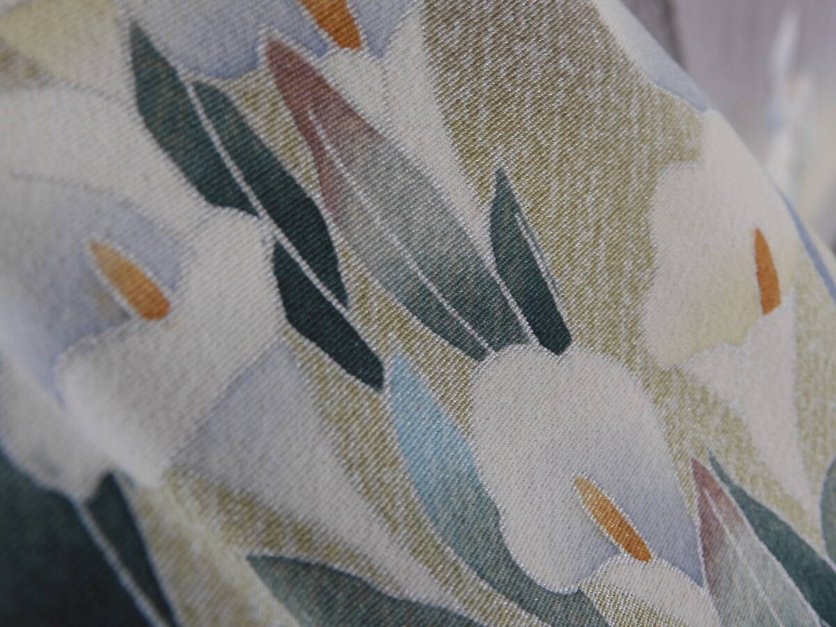ベースは斜めの小さな模様が染められ、その上に水芭蕉が丁寧に描かれています。