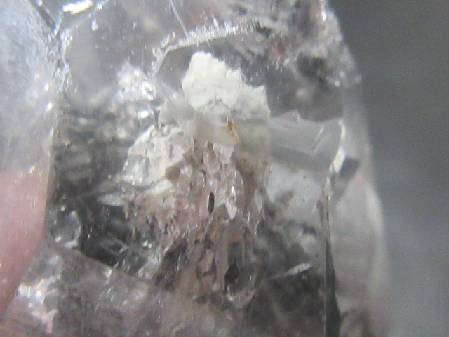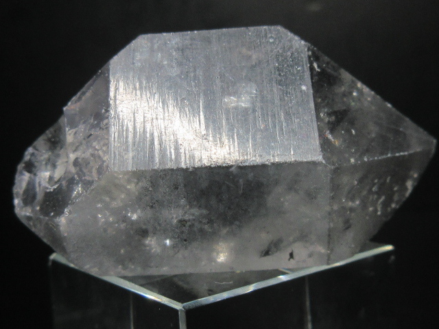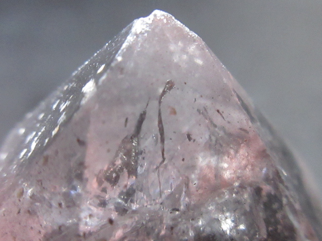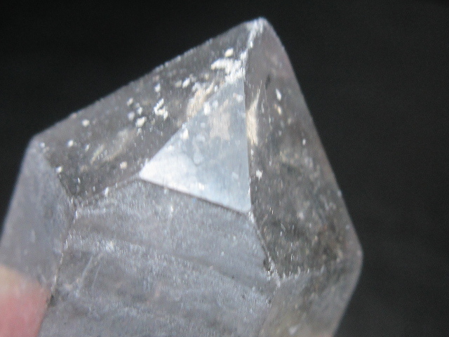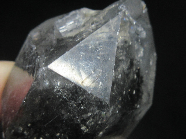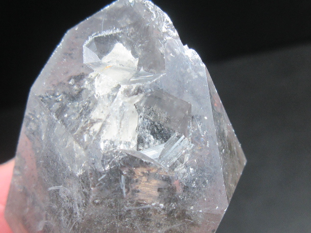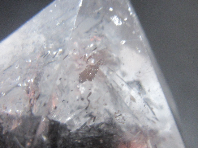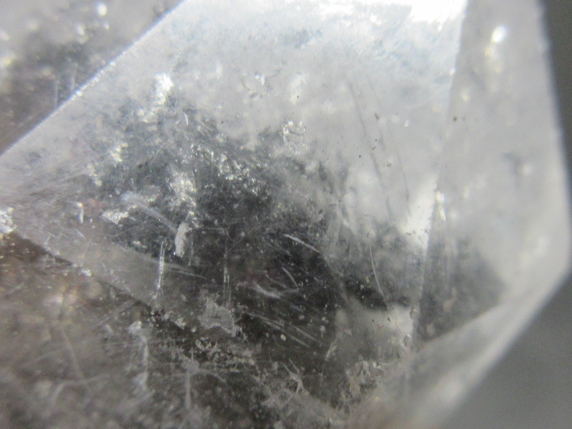 ・片方の錐面上部にカケが見られるものの、表面の一部には2つのハッキリとしたキー触像が見られる水晶です。 内部には灰色鉱物、そして黒色鉱物の内包が見られます。