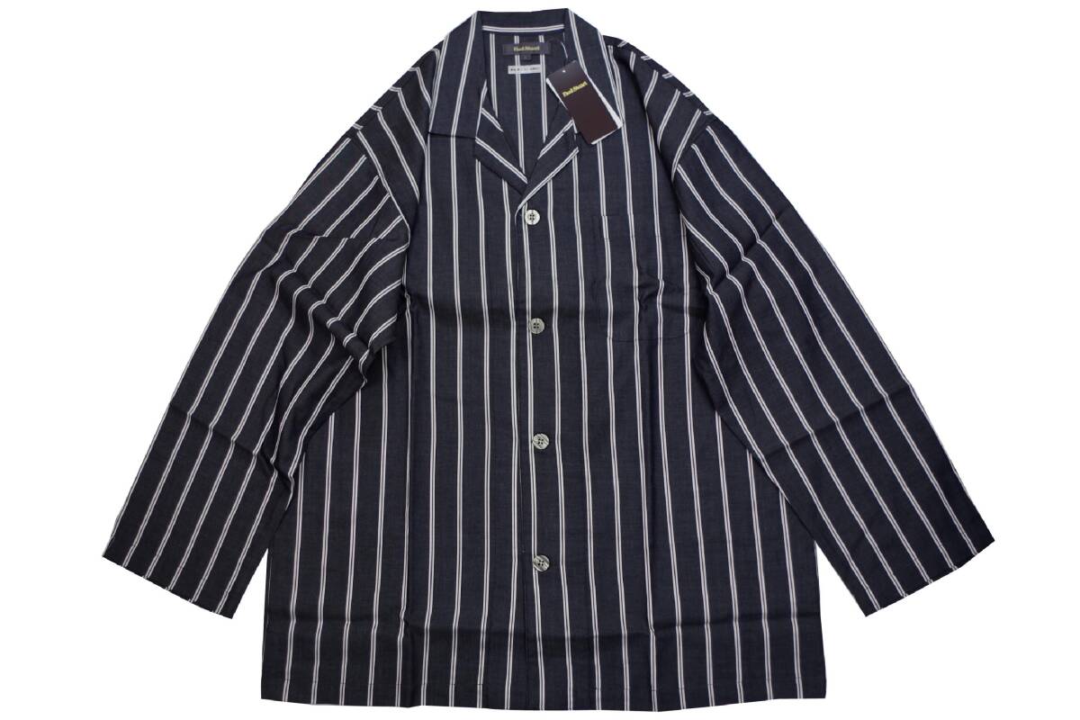 ■ポールスチュアート PAUL STUARTの男性用、テーラー型長袖&ロングパンツパジャマ、新品です。サイズはL、チェスト96-104cm、身長175-185cm、ウエスト84-94cm。パンツは前開き。胸ポケット付き。素材は綿100%、オールシーズンでお使いいただける生地感です。色は黒に近い感じのチャコール系。正規ライセンス会社扱い品です。