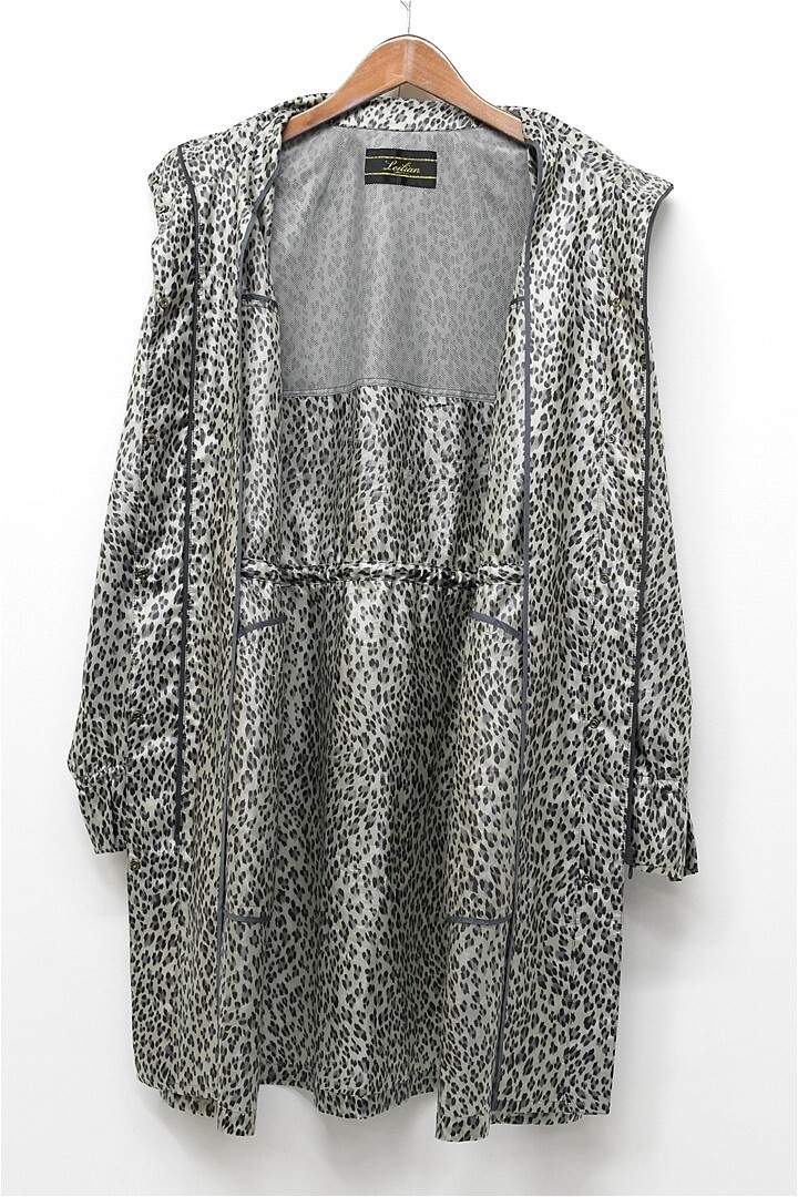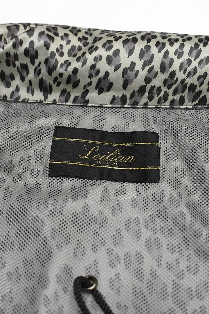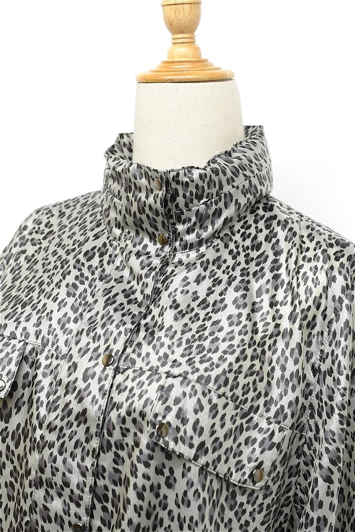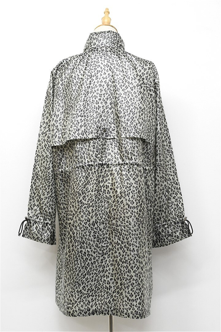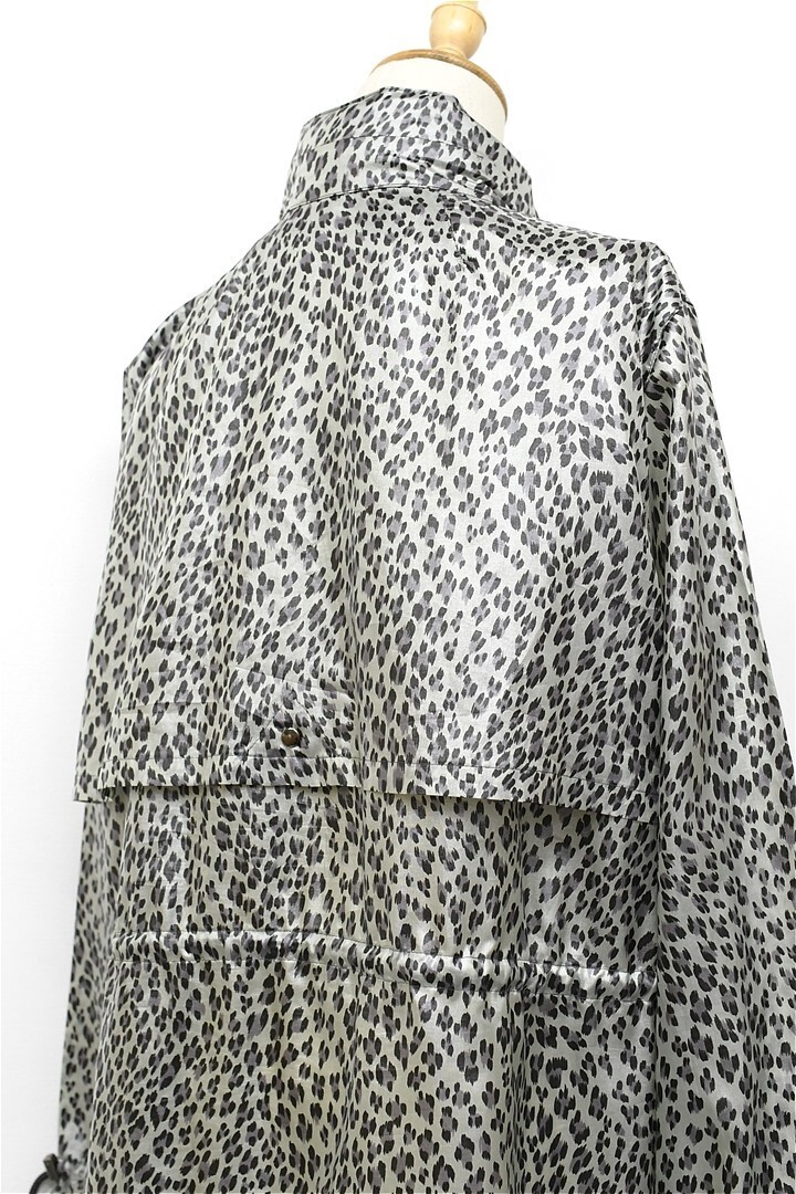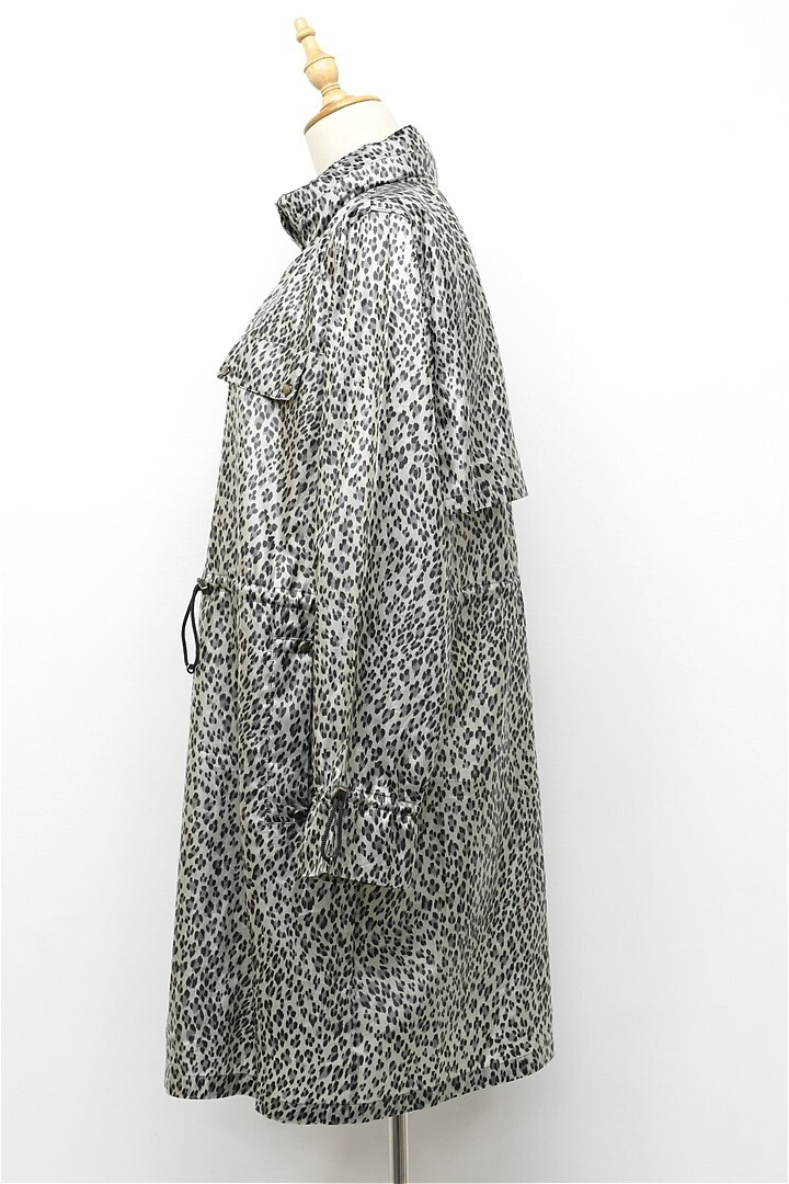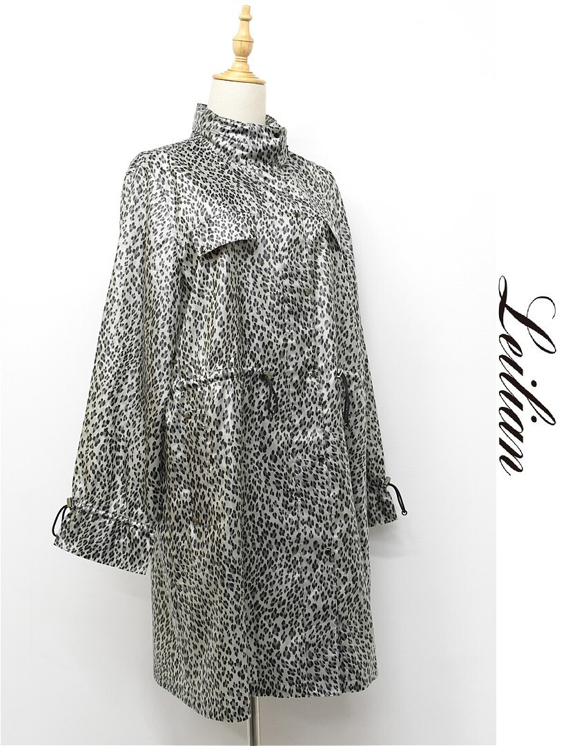 V268/美品 Leilian ロングコート スプリングコート ジャケット 総柄 レオパード柄 ヒョウ柄 薄手 13+ XL 光沢 グレー 大きいサイズ