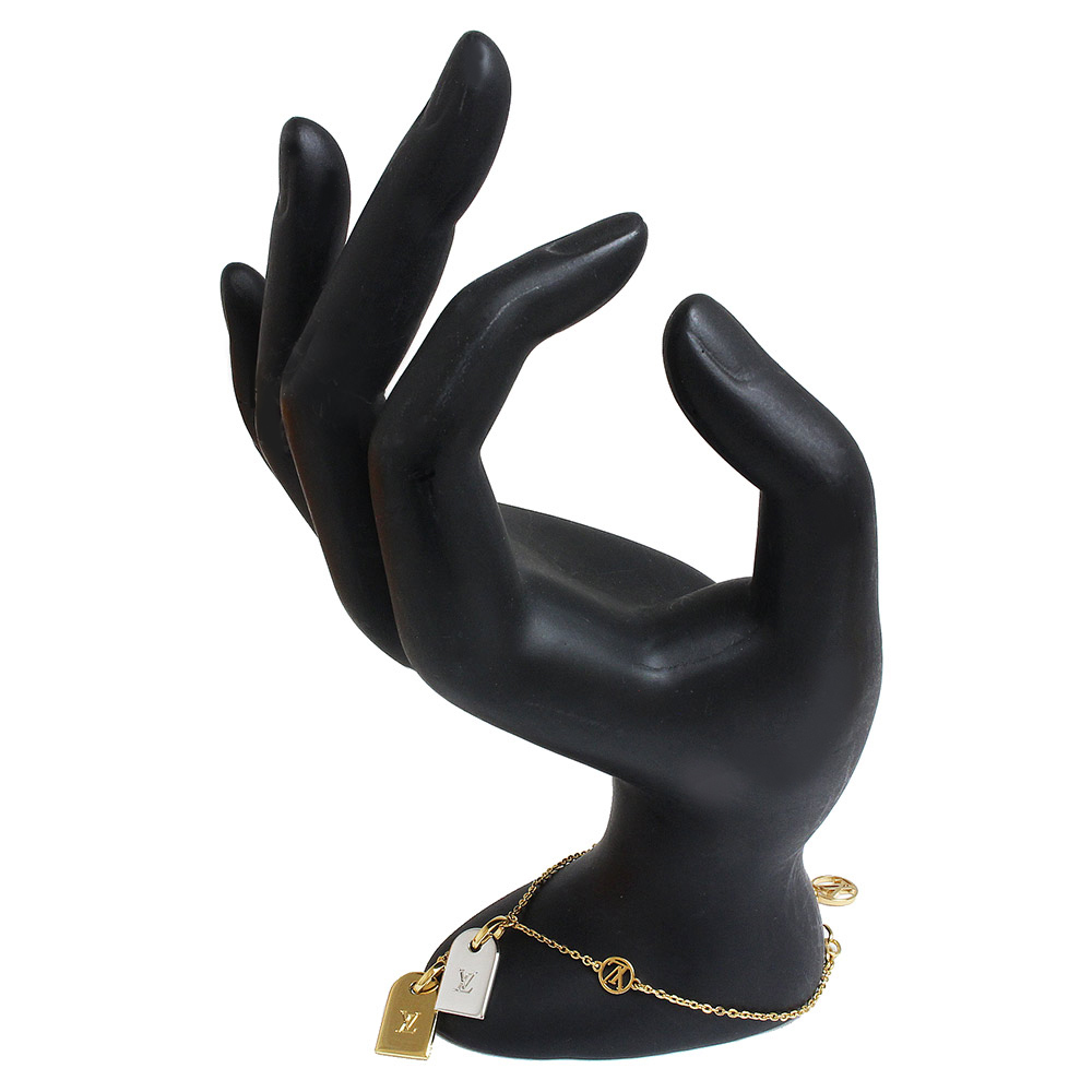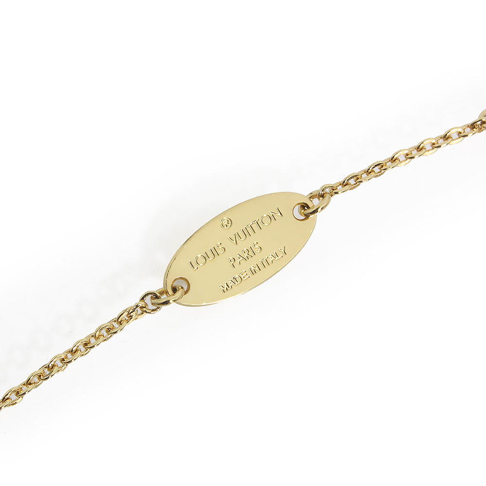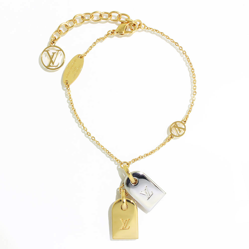 アイコニックなモノグラム・パターンとLVロゴの刻印を施した2つの小さなネームタグ付きの「ブレスレット・ナノグラム」。ゴールドとシルバーカラー仕上げのコントラストを効かせたデザインで「LVサークル」があしらわれたクラスプが特徴です。