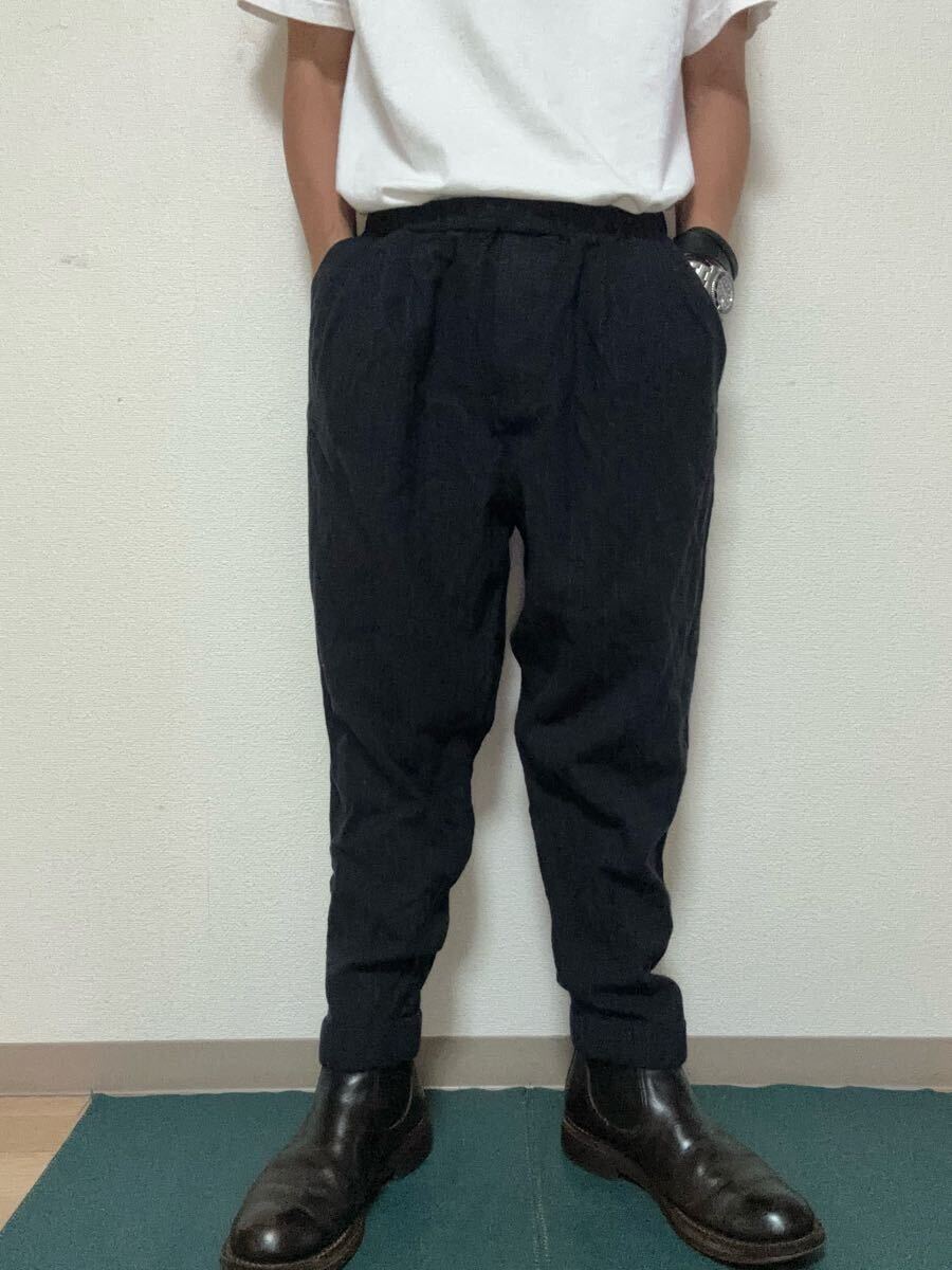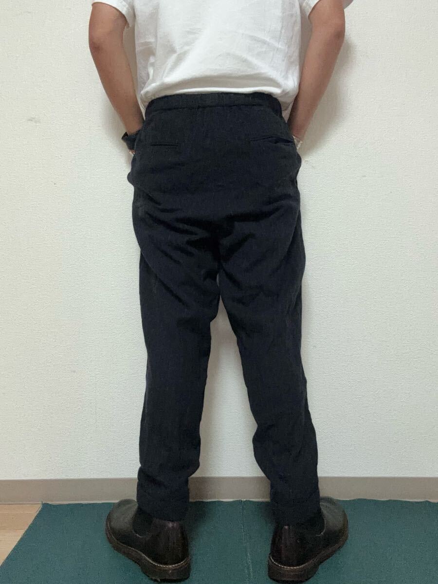 縮絨感あるフランネル素材で独特の存在感がありテーパードした綺麗なシルエットですがストレッチが効いてウエストも楽な一枚です。
