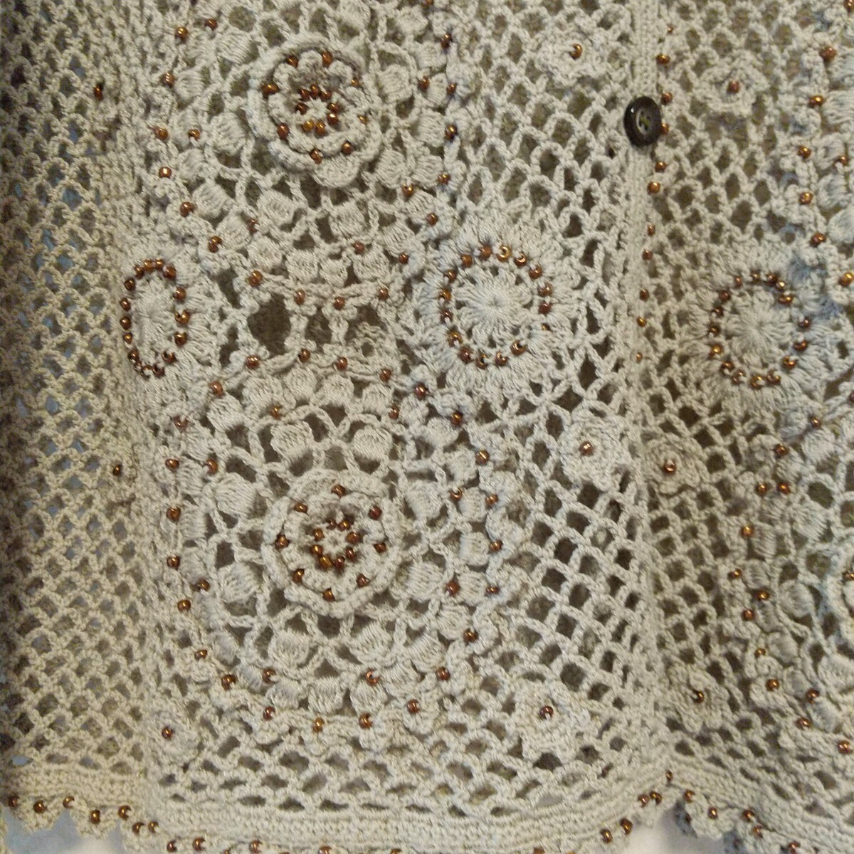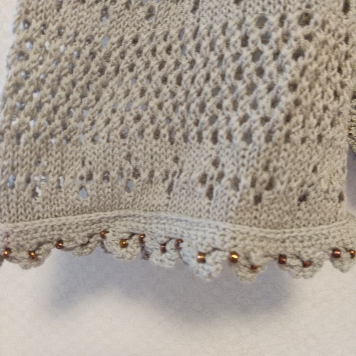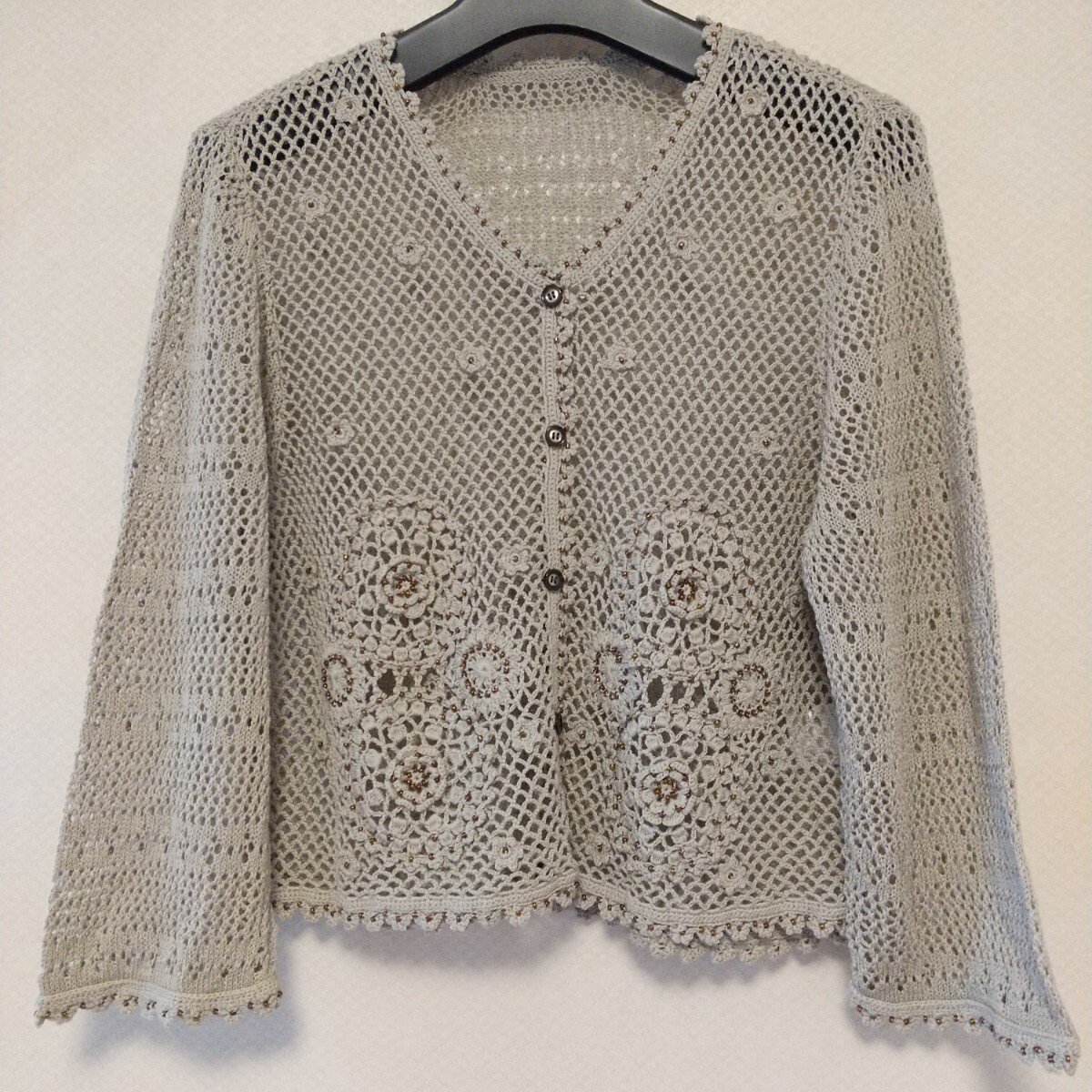 繊細できれいなビーズ飾りがおしゃれなカーディガンです。裾や袖口にもビーズ飾りが施されてエレガントな印象。合わせやすい色目で、少し短めの丈の軽やかなお品です。