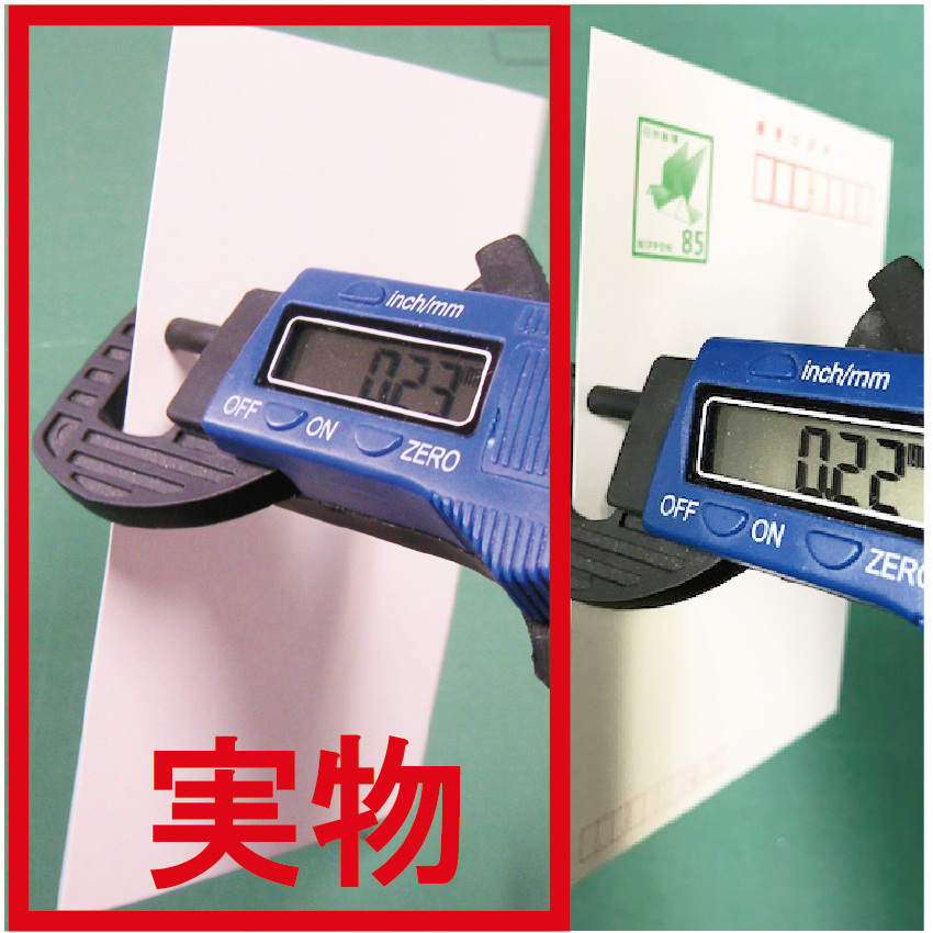 | ★商品説明 | ◇両面無地はがき「メーカー:王子製紙(株)」 サイズ:100mm×148mm(普通のはがきサイズ) (写真参考!) 数 量:50枚 〒 枠:無し 紙 質:両面無地の真っ白な上質紙 色 名:官製はがきより、ほんの少々白い(3枚目写真参考) 重 さ:約3.1g(1枚) 坪 量:209.3g/㎡ 紙 厚:約0.24㎜(官製はがきより少々厚いですが、ほとんど変 わりません)3枚目写真参考 ※他の出品者の安価な商品は用紙の厚みが薄いので注意して下さい |