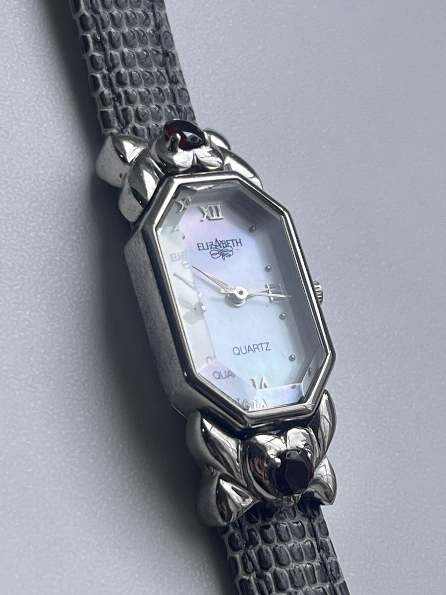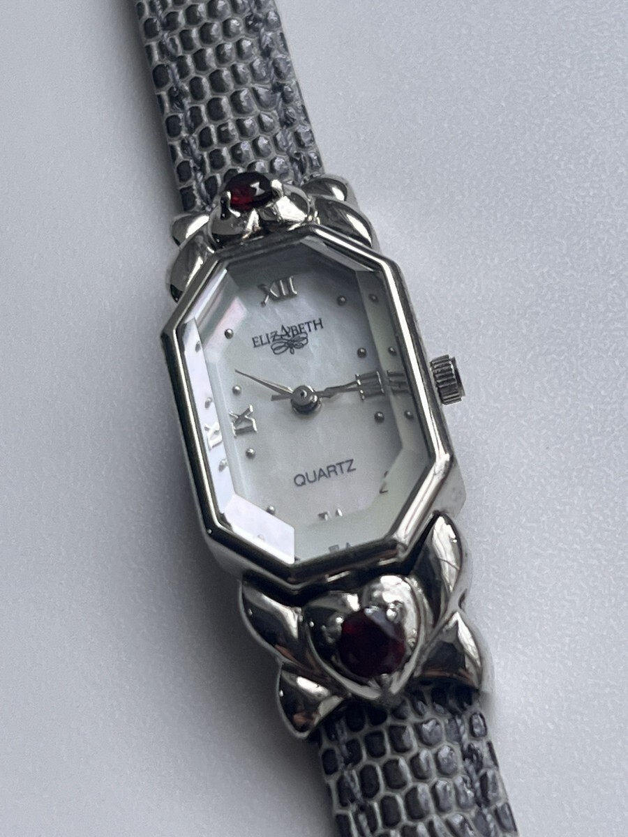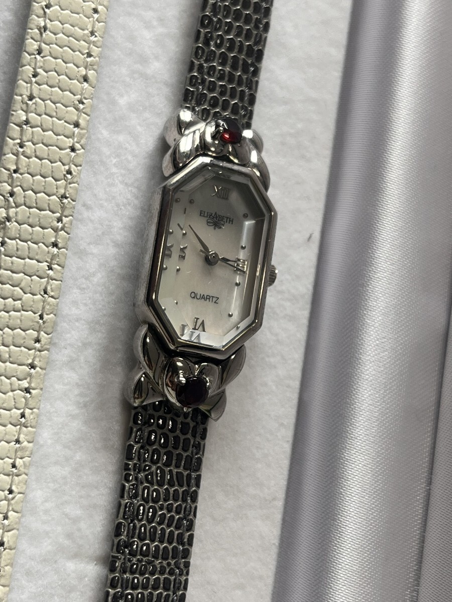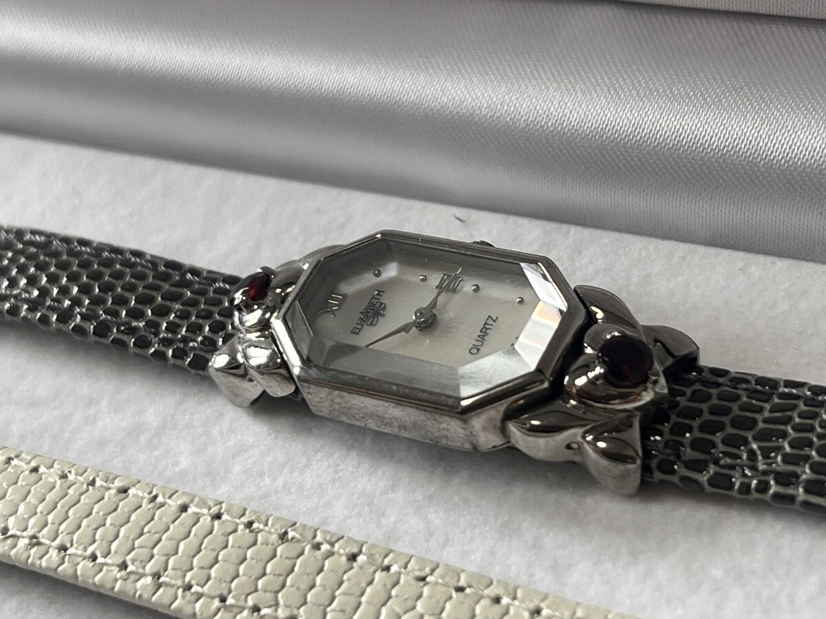 新品未使用エリザベス レディースクォーツ腕時計 シェル文字盤ガーネット石付きです。