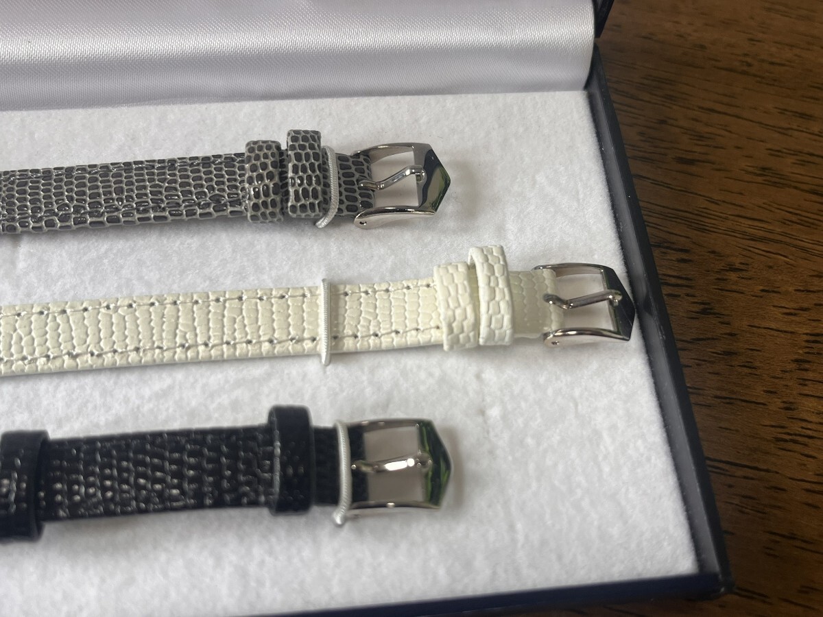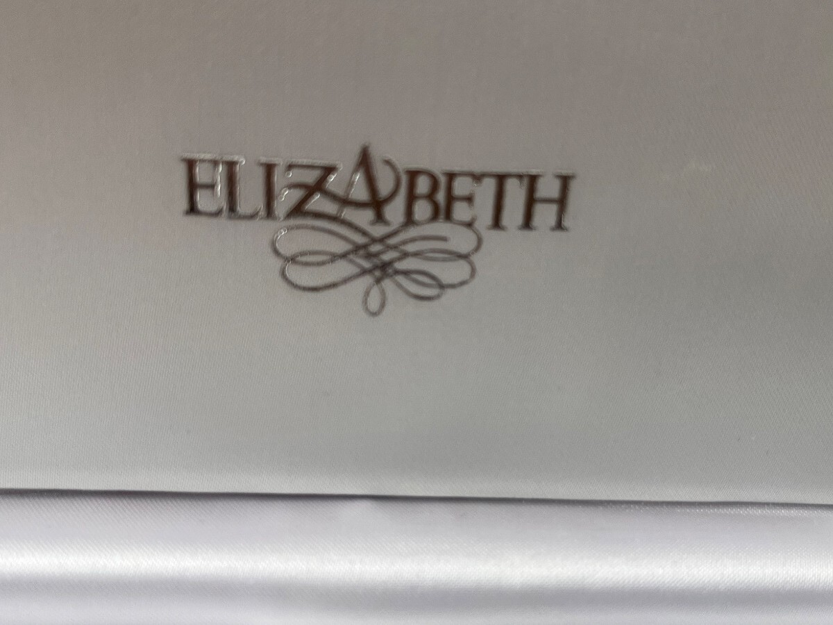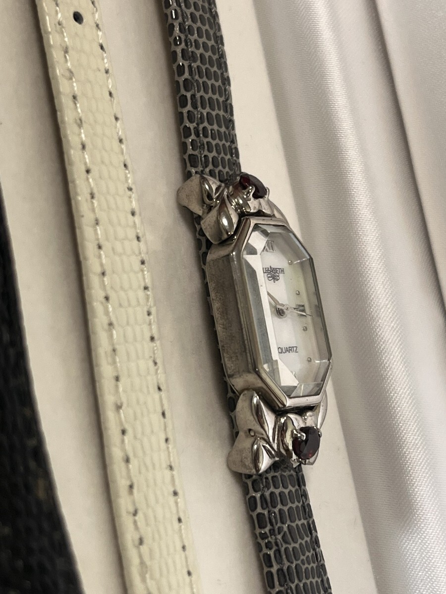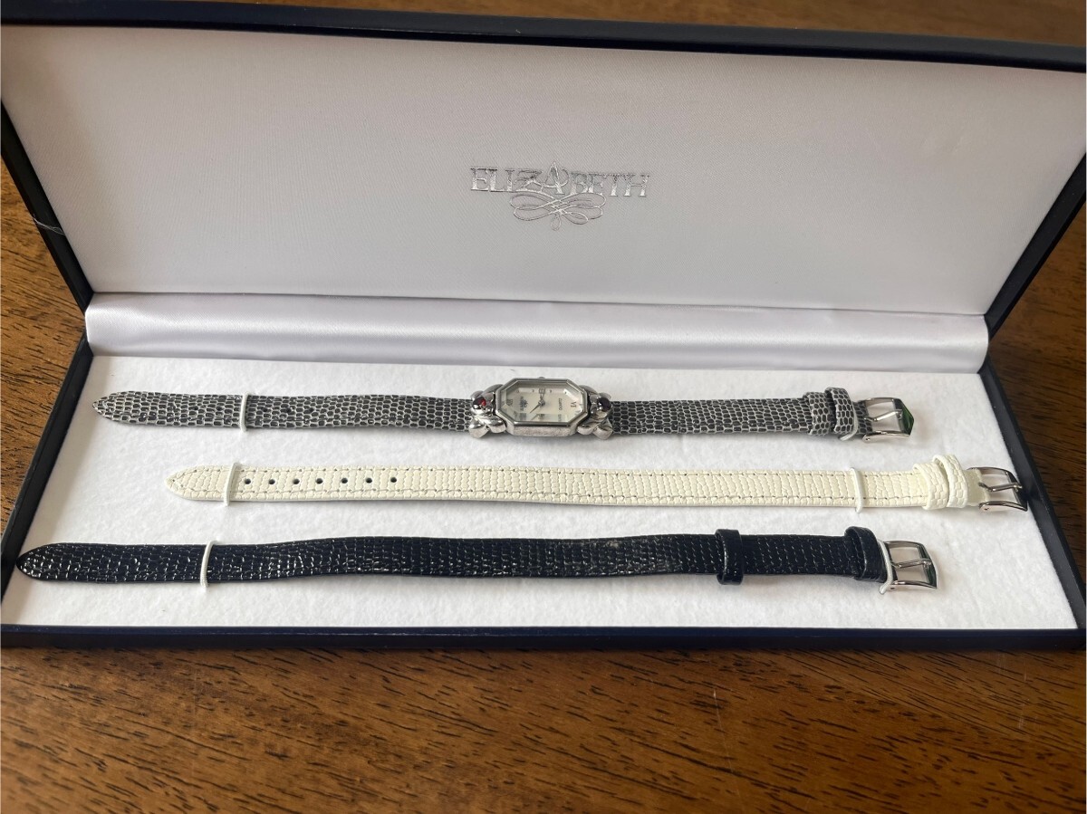 新品未使用エリザベス レディースクォーツ腕時計 シェル文字盤ガーネット石付きです。