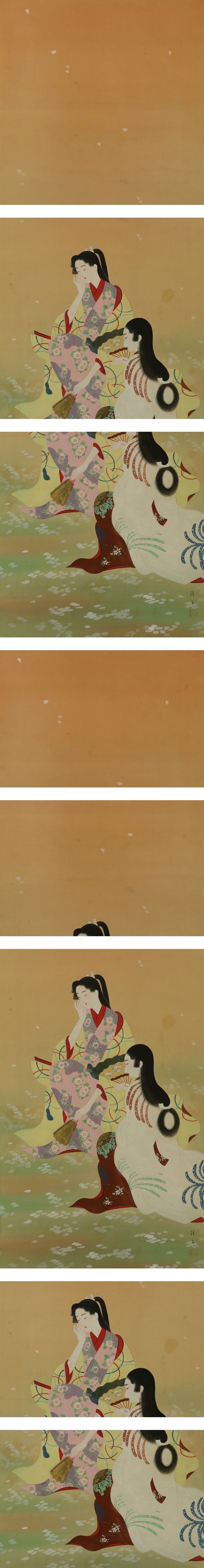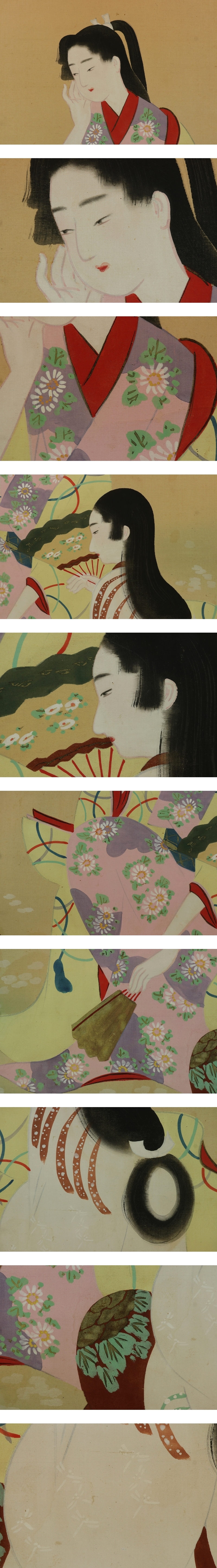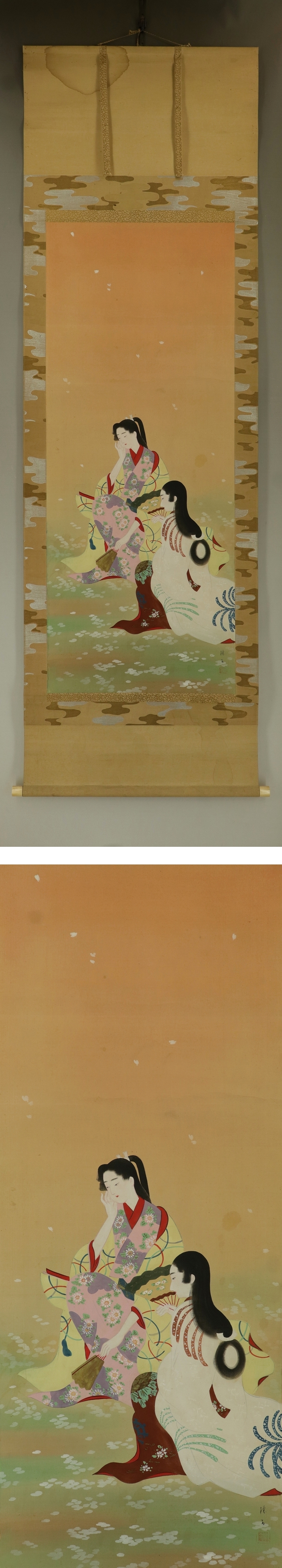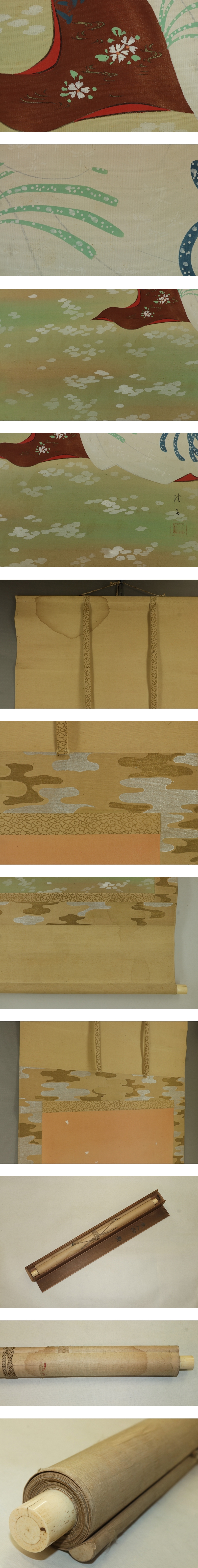 清雨【美人画・舞】 本紙は、染み、汚れ、強い折れ、皺があります。 表装は、染み、汚れ、強い折れ、皺、ヤケ、くすみ、虫食い、破れ、ほつれ、剥れ、 軸先に汚れとヒビ、巻紐にほつれがあります。 【サイズ】 作品 横約51cm×縦約127cm 表装 横約63.5cm×縦約203cm |