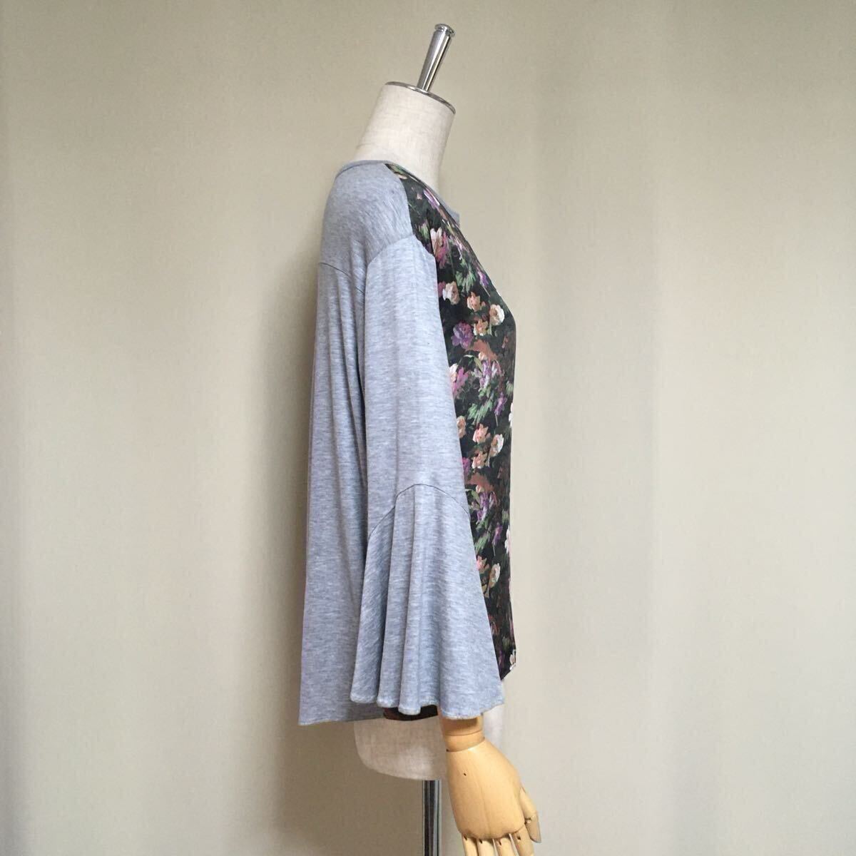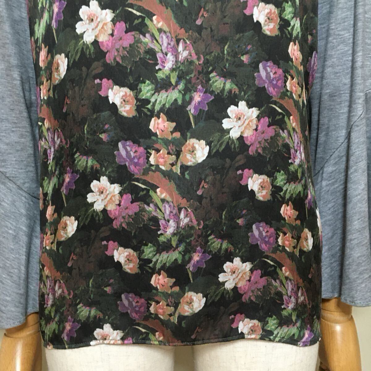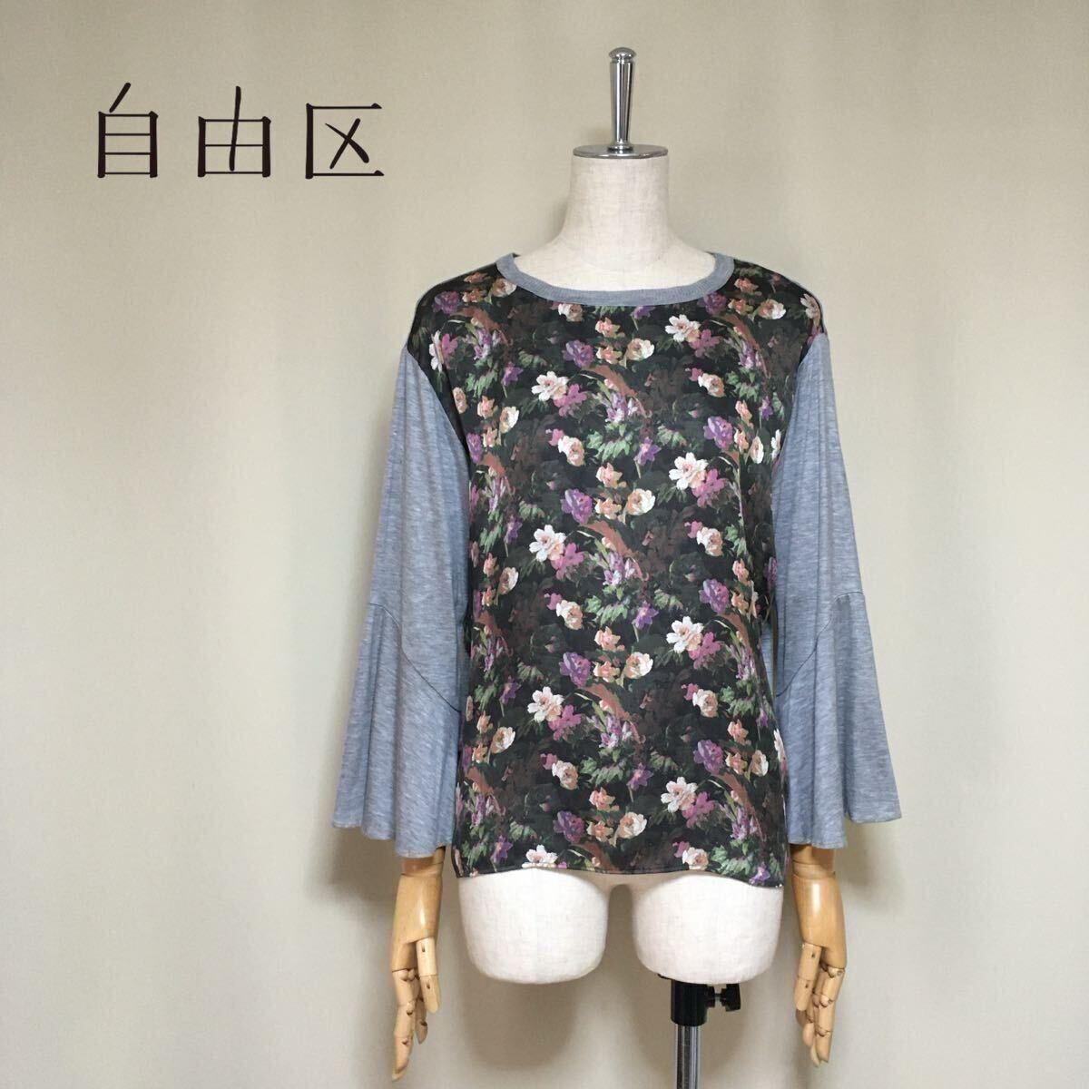 【美品】自由区 LIBERTY リバティ フラワープリント フレアスリーブ カットソー 40/Lサイズ相当 グレー×ブラウン系 レディース リヨセル