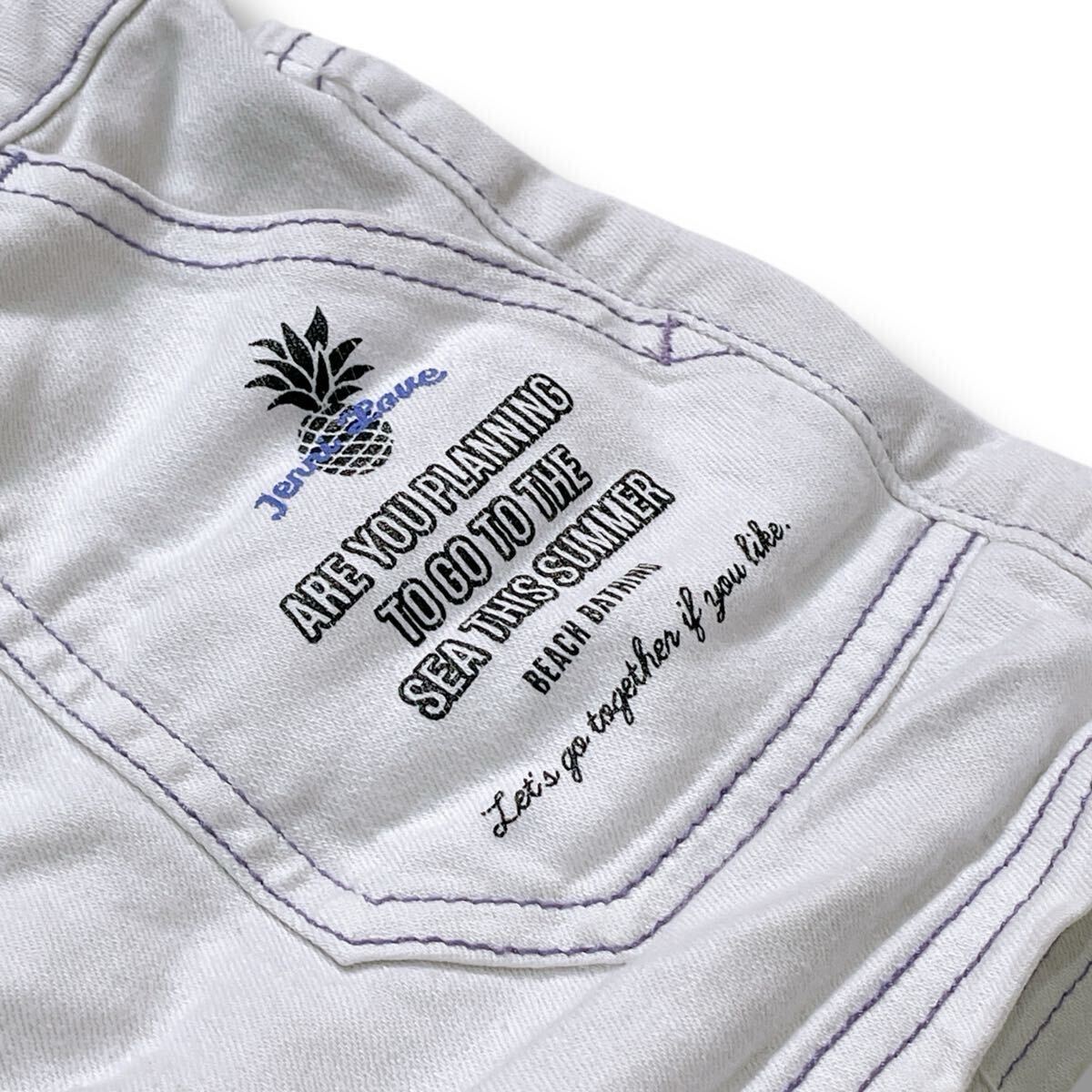 This is a cute JENNI love white shorts with pineapple embroidery, size 130 (height 125-135cm, waist 51-57cm). The item features a summer beach theme with "ARE YOU PLANNING TO GO TO THE SEA THIS SUMMER" text and pineapple design. It's in good condition with no noticeable damage or stains. Made of 90% cotton, 8% polyester, and 2% polyurethane. The Y2K style design is currently trendy again. I will ship internationally via EMS or other available shipping methods. Please feel free to ask any questions.