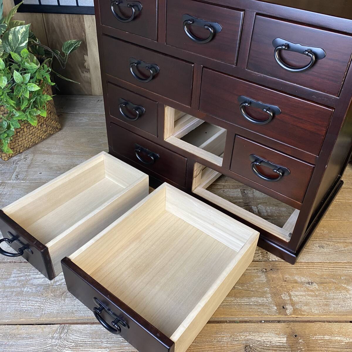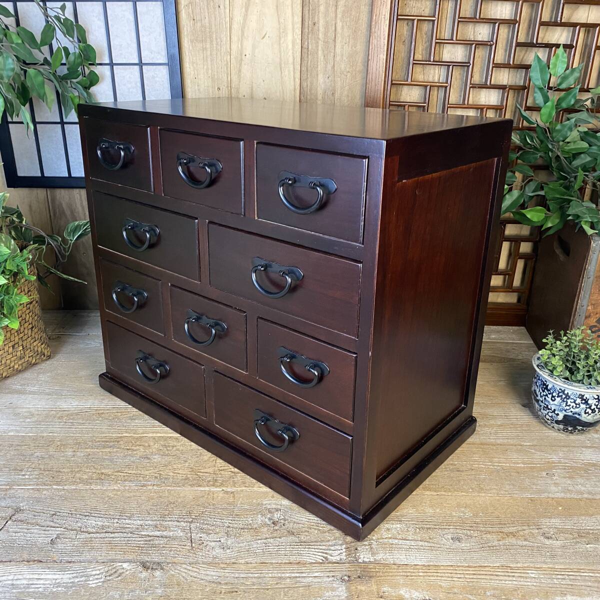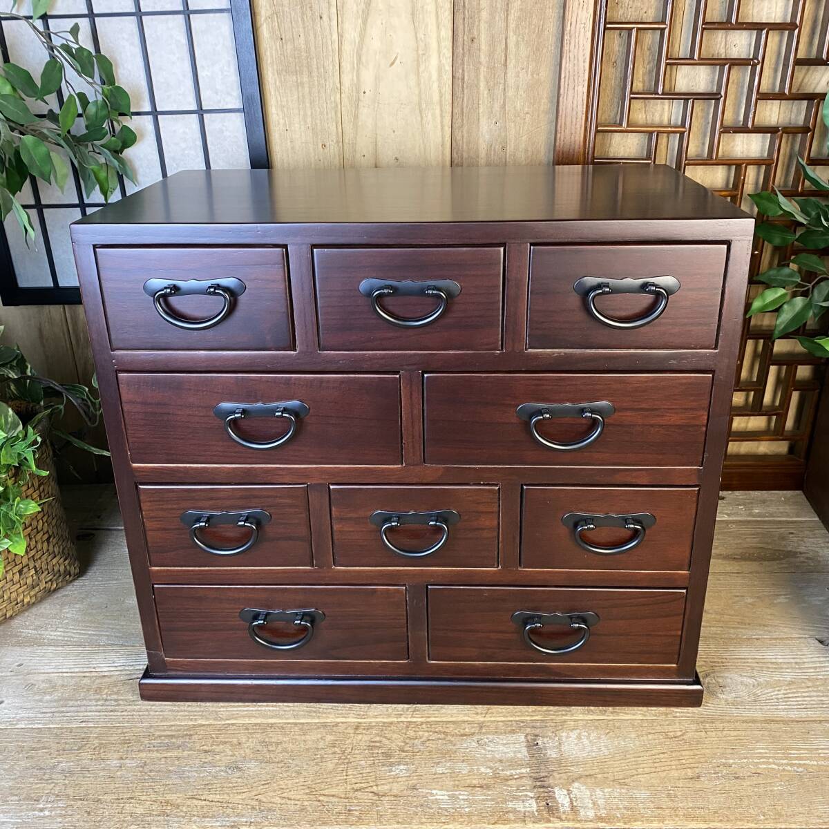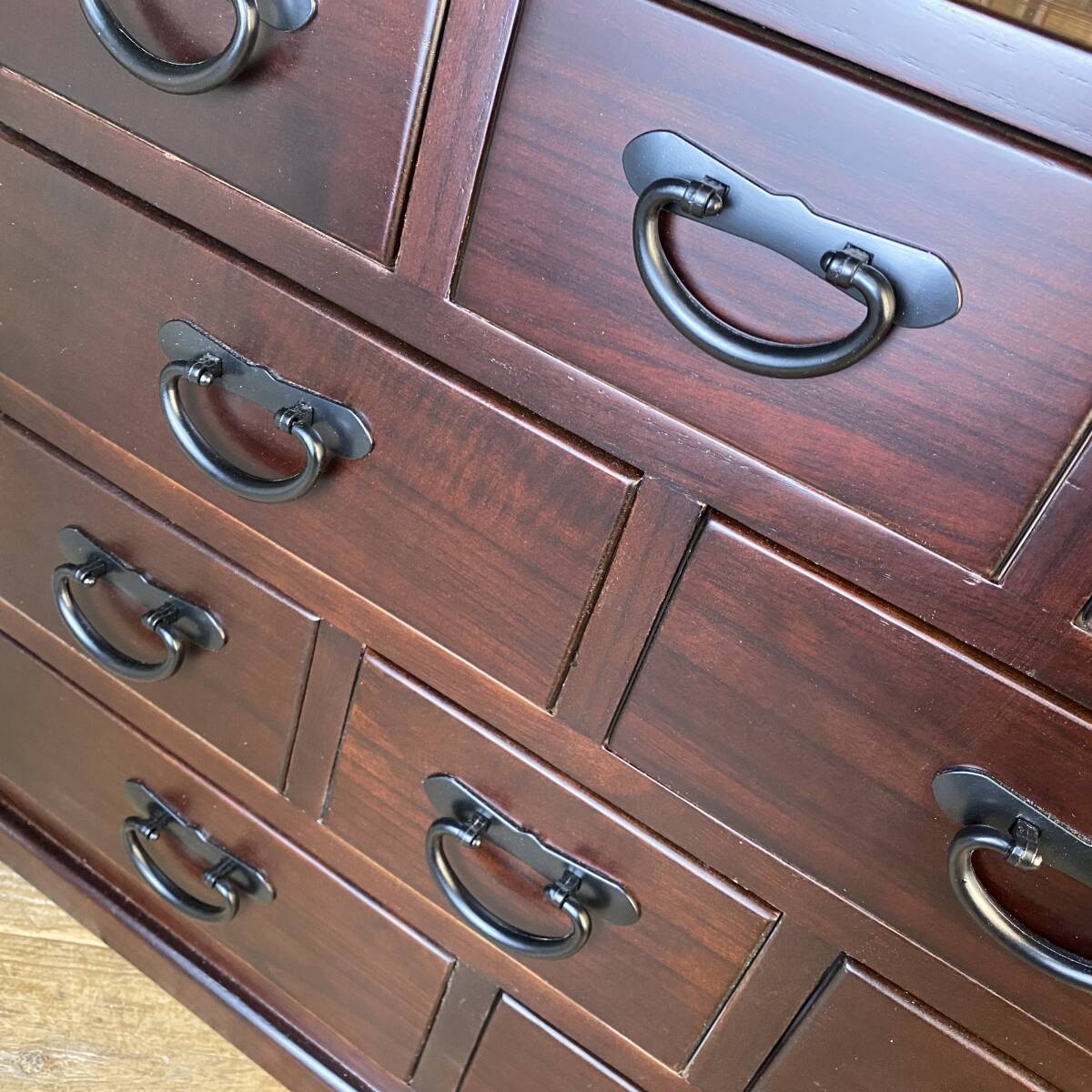 ◆◇商品詳細◇◆ 民芸家具多引き出しタンス 民芸調和多引き出しタンスチェストです。古き良き和の心、深みのあるお色が素敵な品です!お部屋のインテリアやショップのディスプレイ、和室にも合わせやすいですよ!小ぶりなタンスですが、引き出しが多く、小物をたくさん収納できます。アパート小部屋、施設ルーム、寮部屋などに最適なサイズ感です。和室や、アジアンテイストインテリアに良く合うお品です。天板が広く、飾り台やテレビ台などにもアレンジできそうですね! 【商品状態説明】 小キズあり、まずまずの美品。 完成品になります。 ※こちらの商品は、現品画像ではありません。製造段階や輸入段階での小キズ等で検品落ちしたB級アウトレット品の中から順番に発送しております。ほとんど気にならない程度の小キズになり、使用には全く問題はございませんが、気になる場合はご遠慮ください。他に『美品』記載の商品がありますのでそちらをご検討ください。 【サイズ】 横幅:60cm(下部土台含む横幅:62㎝) 奥行:34cm 高さ:53cm 引出し内寸大24.5cm×29cm×8cm 引出し内寸小14.5cm×29cm×8cm 【素材】 木製桐材無垢 【カラー】 ブラウン 【完品参考価格】 ¥19.800 | ◆◇発送方法◇◆ ●送料は基本無料ですが、沖縄・離島などにお住まいの方はご負担ください。 (沖縄・離島の方はメールにてご連絡いただければ、送料をお知らせいたします。) ●ヤマト運輸・佐川急便・第一貨物のいずれかにて配送いたします。 (運送会社の指定はできません。ご了承ください。) ●日時・時間指定のある方や、お問い合わせ(追跡)番号をご希望の方は取引連絡の際にお知らせください。 | |