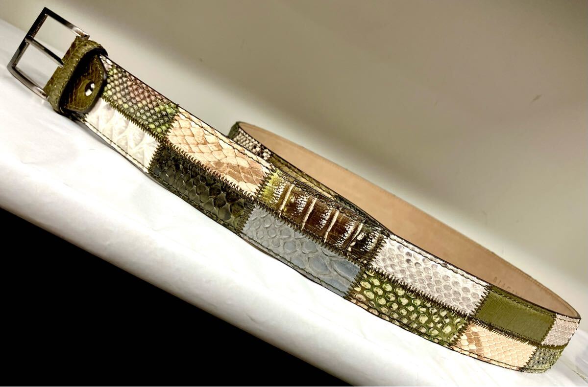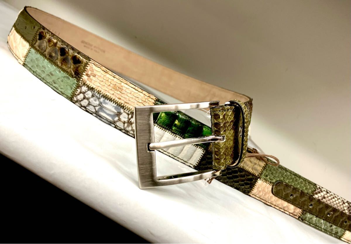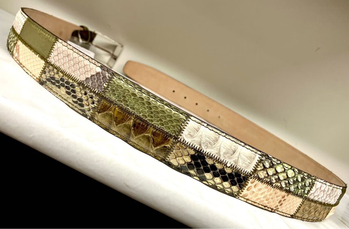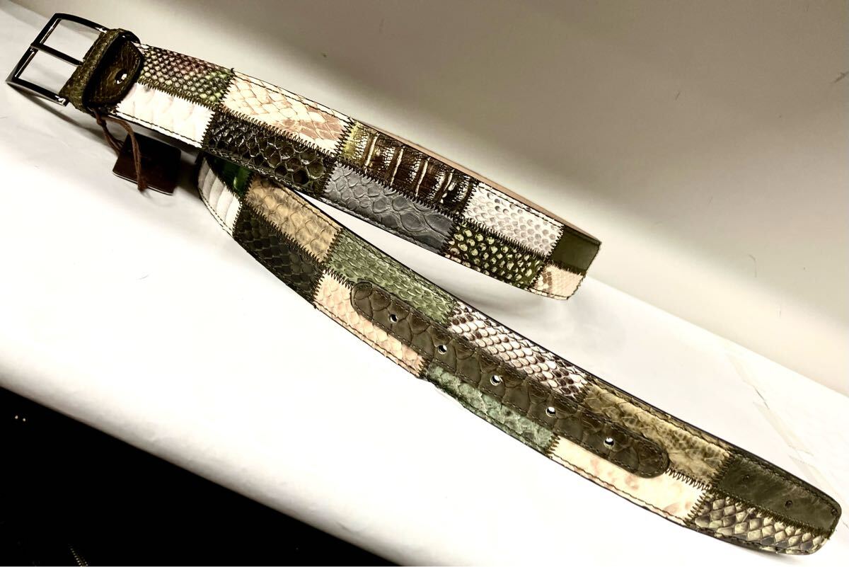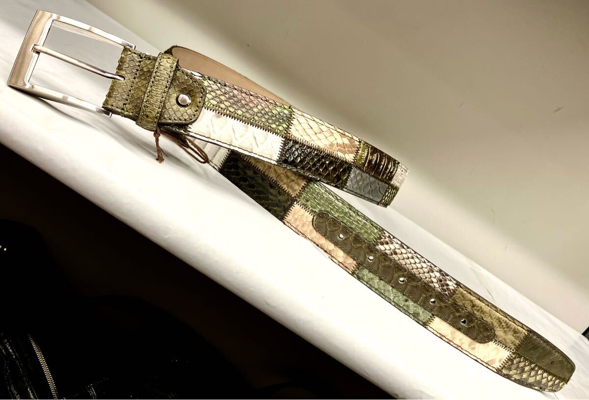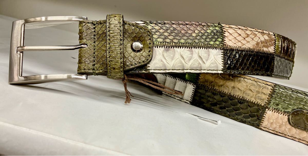 多種の蛇革をふんだんに使い仕上げたメンズフリーサイズベルト、色は革ごとに違います。