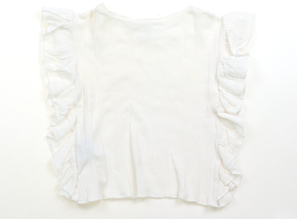 実際のサイズ表記は2-3years/98cm。ポリウレタン混コットン素材。前身頃広範囲に複数の薄茶色いシミあり。洗いざらし感がありますが、普段使いにいかがでしょうか。