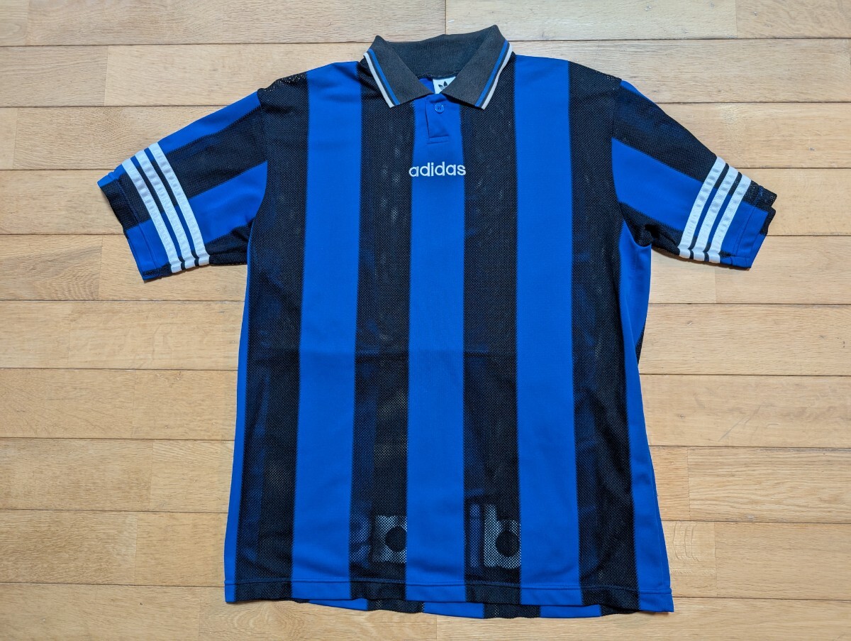 商品説明 | adida製の半袖プラスチックシャツの出品です。 インテル風のブルーとブラックの縦縞です。 黒の部分は網生地になっており、夏場は風通しがいいです。 ポリエステル100%素材です。 襟のみ綿60%、ポリエステル40%素材です。 カラーは、ブルー×ブラックの縦縞のインテルユニフォーム風でとてもカッコいいです。 標記サイズはOーXOです。 身幅56cm、着丈76cmの実寸を参考にしてください。 |