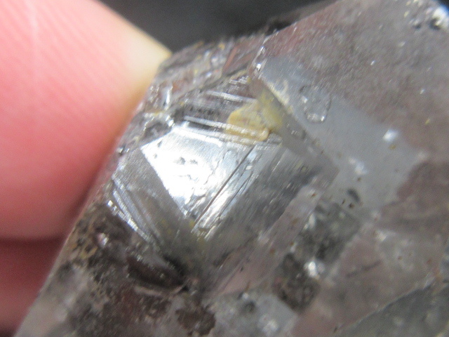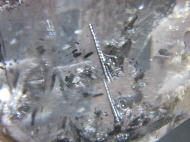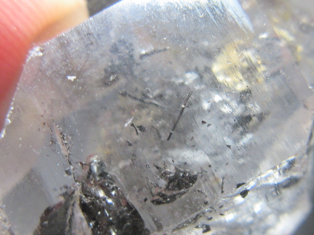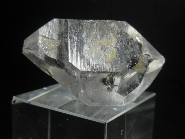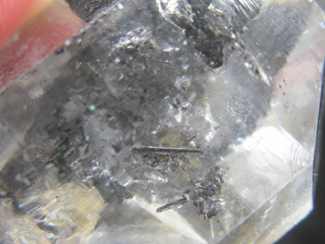 ・非常に透明度が高く、ファセットの一部にキー蝕像が見られる珍しい水晶です。 内部には黒色棒状鉱物、そして黒色鉱物の内包が見られます。