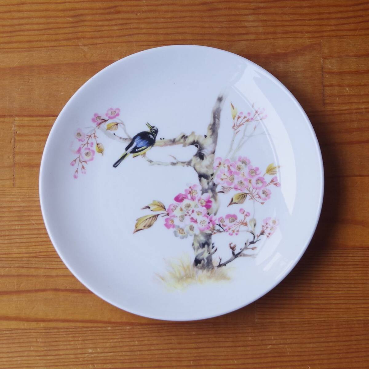 桜と思われるピンクの花をつけた木と、その枝に留まった黒っぽい鳥が描かれています。