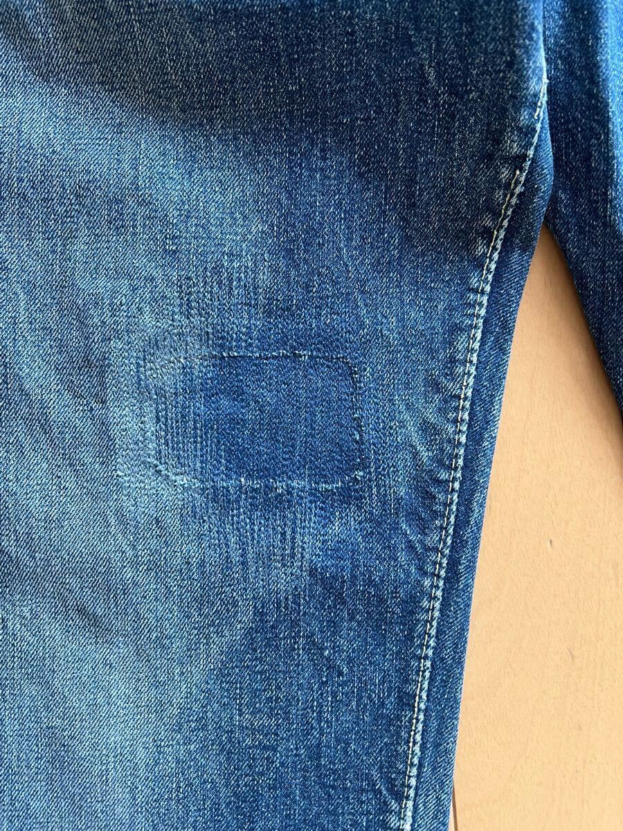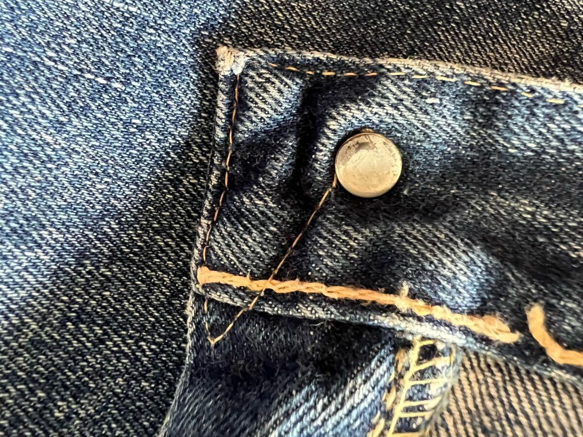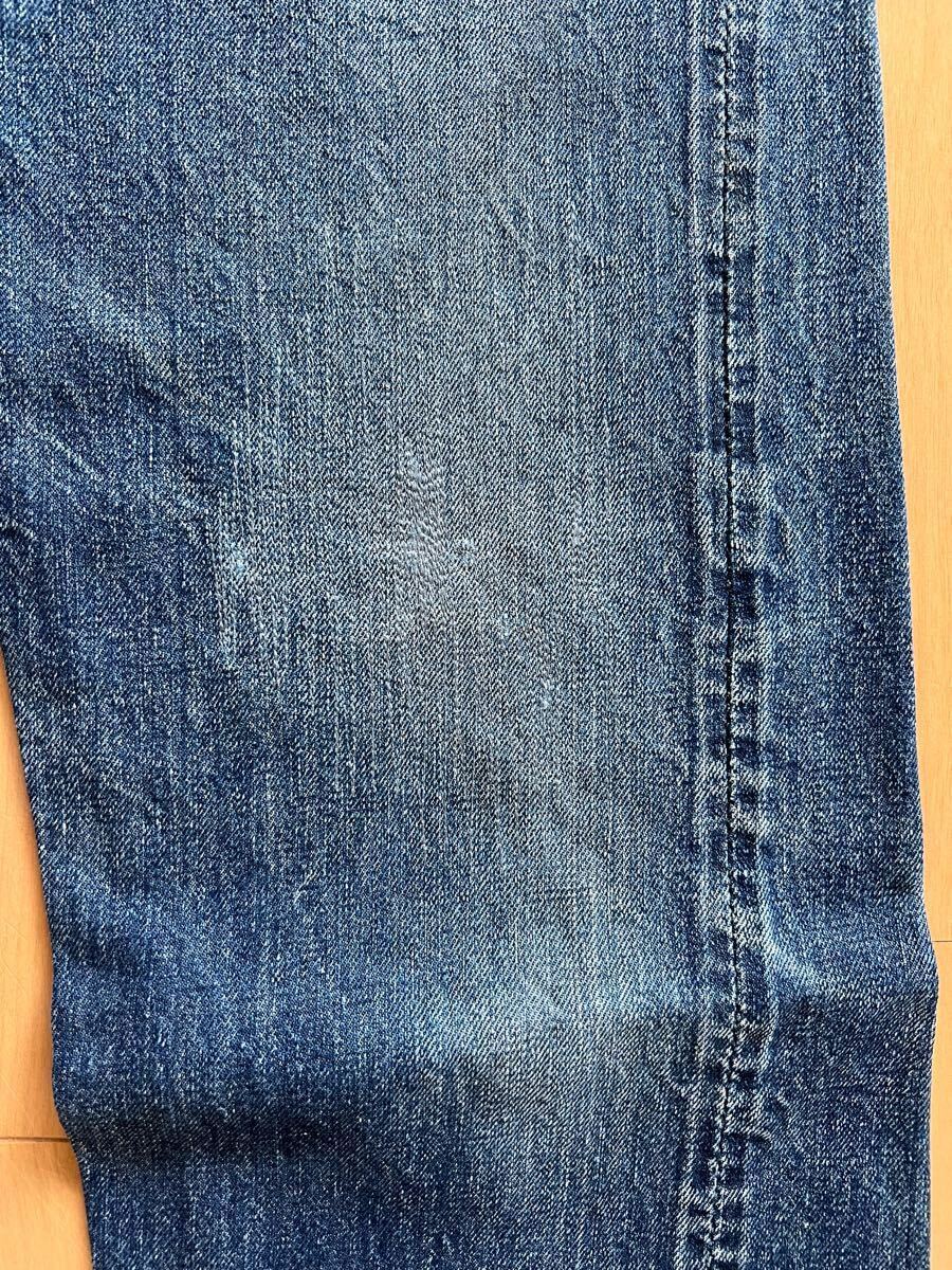 パッチは取れていますが、ポケット裏鉄リベット(鉄製、銅メッキ)センターループオフセット、小釦足長R。イエローステッチが多め。以上のディテールからギャラ入り紙パッチモデルと断定できます。当然オリジナルレングスです。両ひざ、ウエストにヴィンテージリペア専門店でのリペア跡がありますが、馴染んでおり目立たない状態です。しっかりリペアを施してあるので安心して履ける状態です。