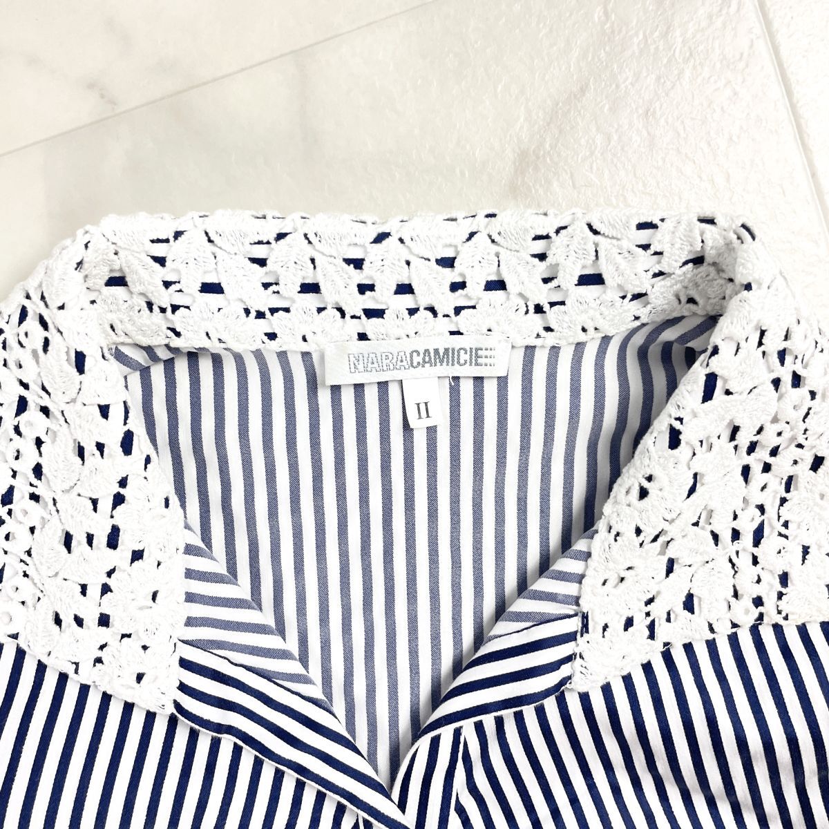 美品 NARACAMICIE ナラカミーチェ ストライプ長袖シャツ ラメ 開襟ブラウス レース切替 レディース 青 ブルー サイズ2*CD281