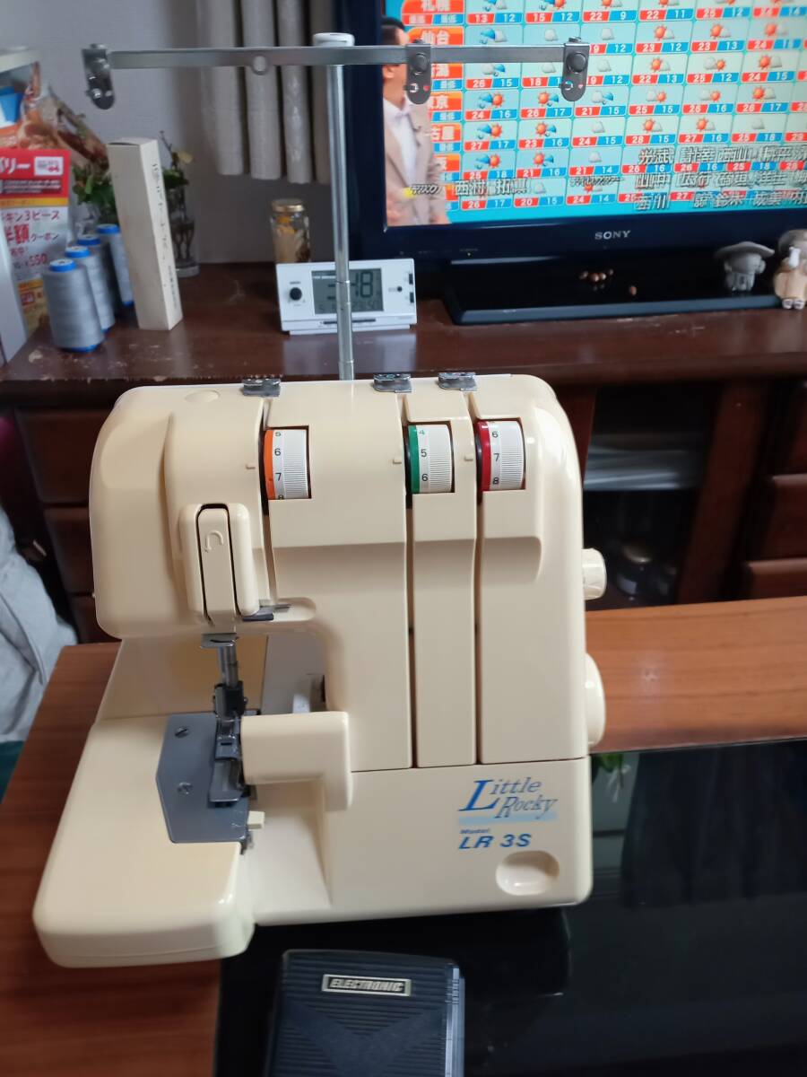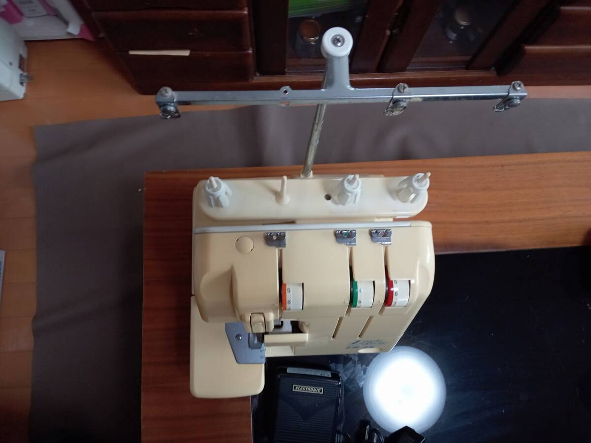 糸かけ4つありますが、3本糸ロックミシンです。電源スイッチ壊れてますが、ランプはつきます。問題なく綺麗に縫えて使えます。